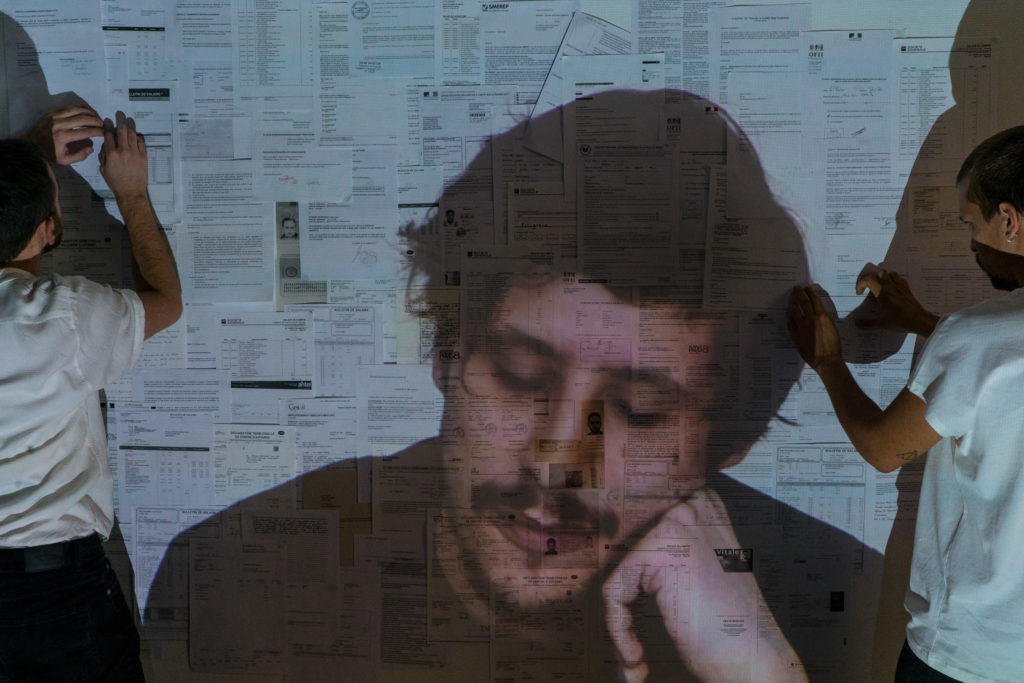 À l’image de cette initiation qui repose sur la rencontre, le déplacement, et le dépassement, l’œuvre de restitution « Contracto » rassemble les médiums et offre une réflexion riche sur l’articulation complexe des notions d’identité, d’autorité, d’espace public et d’espace privé. L’installation nous plonge en immersion dans un lieu au parfum de salle d’interrogatoire, où documents et témoignages vidéo racontent dans une forme chorale le parcours du couple et de son installation en France. En présence silencieuse mais signifiante, les artistes sculptent l’histoire avec leurs propres corps dans l’installation. Ils accrochent un par un, séparément ou ensemble, des centaines de documents imprimés formant petit à petit une muraille de papiers sur laquelle sont projetés les interrogatoires réalisés avec leurs proches à leur sujet. Données, témoignages, gestes et émotions recomposent par la négative le processus de construction identitaire du couple en France.