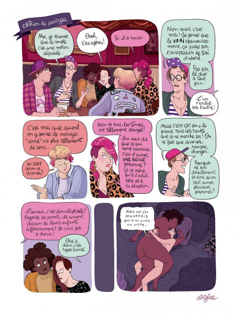 La première fois que je l’ai rencontrée c’était à Angoulême et je dédicaçais ma BD précédente. Elle est venue faire la queue pour se la faire dédicacer et elle m’a laissé la sienne, Forever Bitch. Je suis allée sur son blog, j’ai découvert son travail. Et j’ai vu qu’elle empruntait un tournant féministe. Au fur et à mesure que le manifeste était avancé, que les chapitres étaient déterminés, s’est posée la question de l’illustration, et Diglee c’était une évidence. Je voyais qu’on était raccord sur certaines questions de féminisme. Il y a plein de féminismes et ce n’est pas parce qu’on est féministe qu’on va forcément bien s’entendre, notamment sur la prostitution, l’intersectionnalité par exemple.