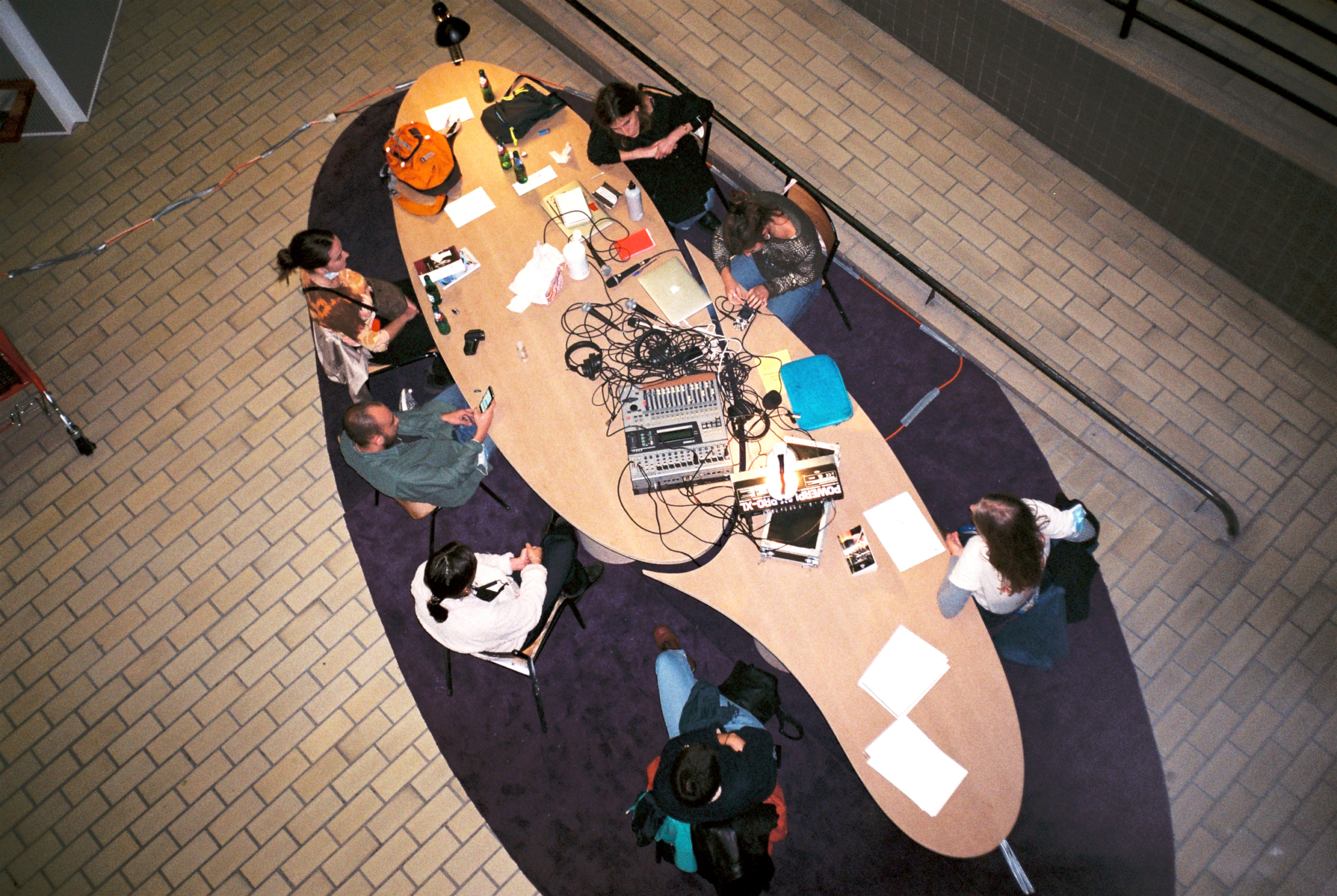 J’ai mis en place une programmation, sur toute la semaine des diplômes. Dans le hall de l’école, j’ai installé une grande table en bois, avec des micros et du matériel son, un peu comme un dispositif radio. Tous les soirs à 18h, pendant une semaine, j’invitais des gens à discuter, ou faire des lectures à cet endroit. C’était enregistré et diffusé dans toute l’école. Les discussions portaient sur des questions d’économie, de féminisme ou de condition étudiante. C’était un dispositif pour rassembler la parole et la faire résonner dans l’espace.