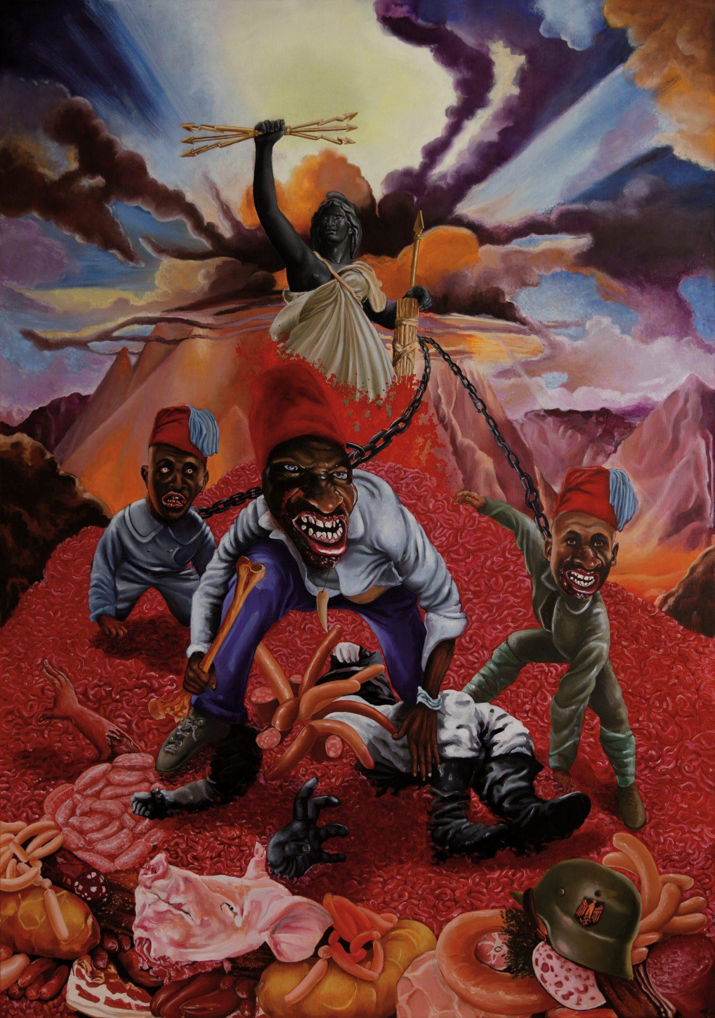 Nadia Valentine a quant à elle un parler franc et sans détour. En mettant à mal tous les clichés de l’imagerie coloniale, ses oeuvres forment un cocktail détonnant et ne laissent pas indemne. C’est que l’artiste ne se ménage pas pour crier haut et pointer du pinceau.