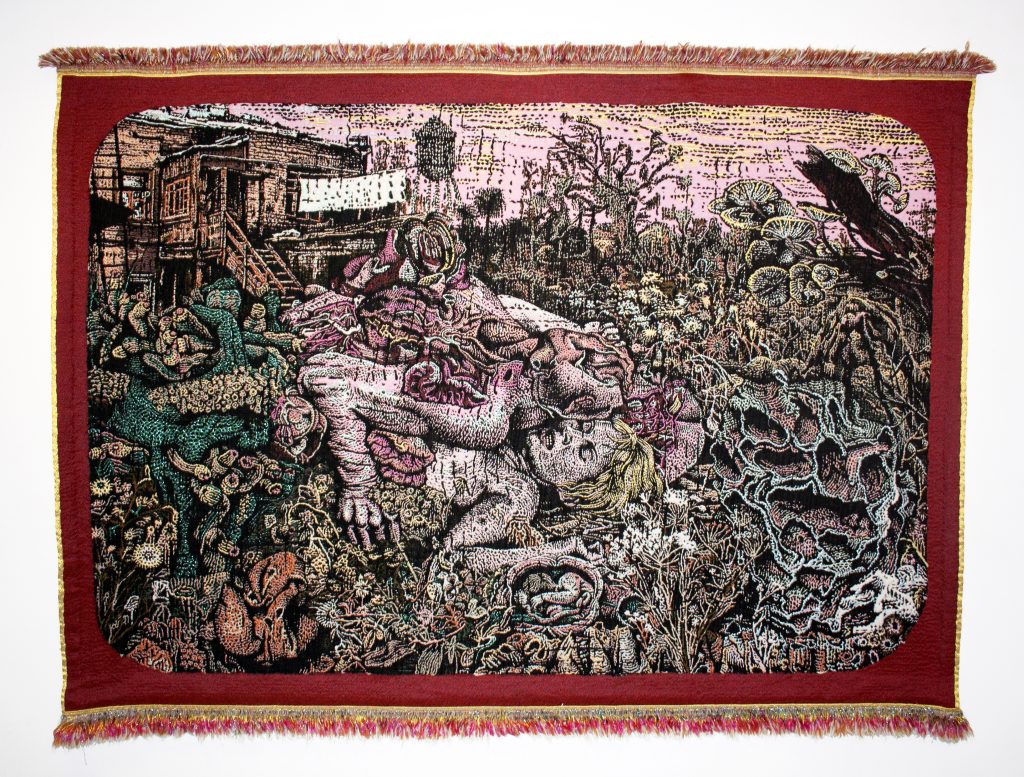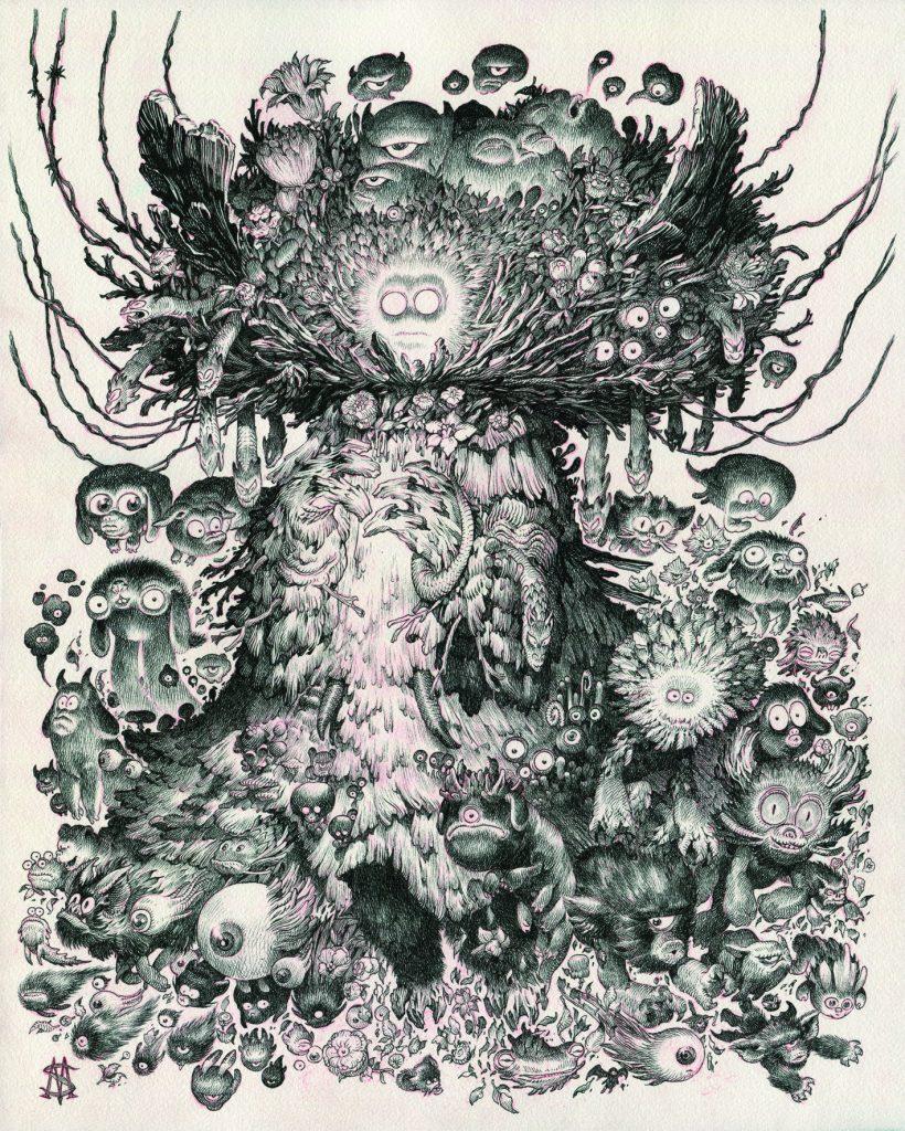 La galerie Arts Factory, fondée par Effi Mild et Laurent Zorzin, explore la scène graphique contemporaine depuis 1996. Installée dans un espace de 250m² répartis sur quatre niveaux, la galerie donne une visibilité à un domaine longtemps ignoré par le marché de l’art traditionnel. Programmation tournée vers des talents émergents et figures incontournables de l’undergraphisme international et de la bande dessinée indépendante, la Arts Factory révèle un panel éclectique de l’outsider art et du pop surréalisme contemporains. À l’occasion de la sortie du n°29 de la revue en librairie, Anne & Julien occupent les lieux de la Arts Factory pour une première exposition-vente en cohésion totale avec la ligne directrice de la galerie. Avec un espace librairie riche et diversifié, il est peu probable d’en ressortir les mains vides. L’exposition est réjouissante, aussi pittoresque qu’éclectique. Artistes venus des quatre coins du globe, éclectisme des médiums et des approches, on en sort des confettis pleins les mirettes.