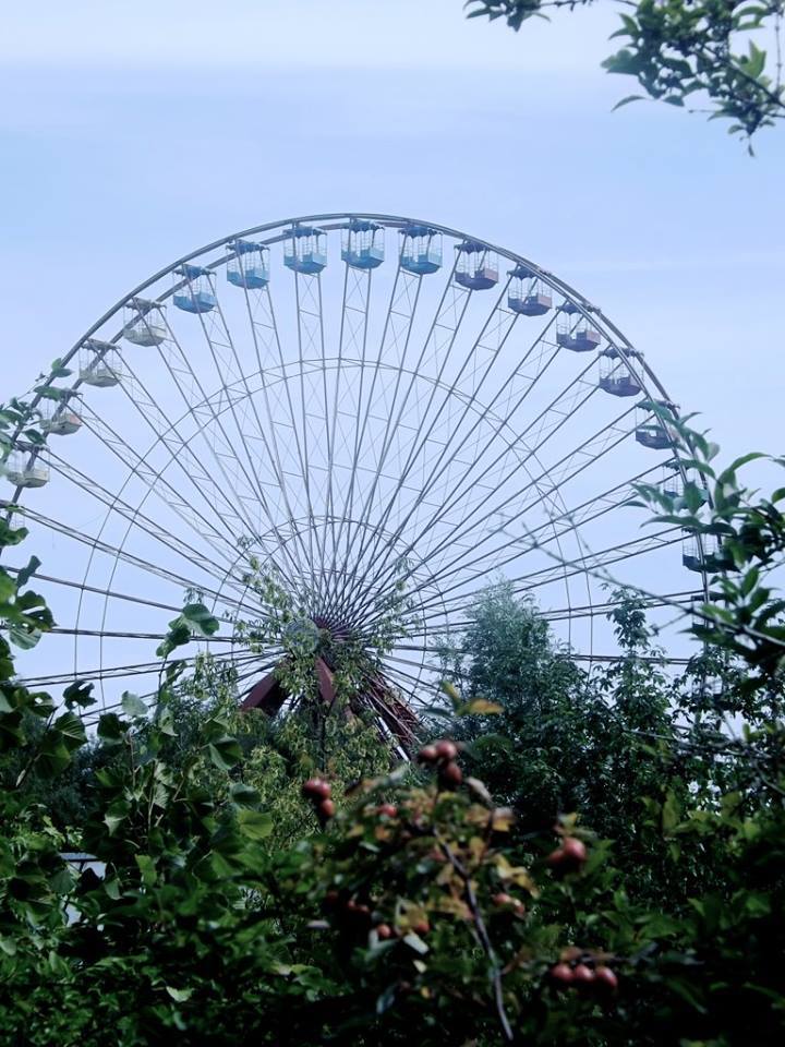 Armée de mon appareil photo, de mon intrépide compagnon et de mes baskets pailletées, j’ai pris la route sous un soleil de plomb pour Berlin Est, direction le SpreePark. Une fois arrivés dans le bois, encore faut-il trouver le parc. Après de longues minutes, un bout de grande roue apparaît à la cime des arbres. Le SpreePark se tient devant nous, derrière un imposant mur de grillage et de barbelés.