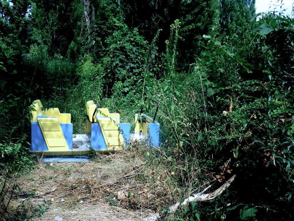 Durant une heure, dans un silence total, nous nous sommes promenés au milieu des attractions abandonnées, délabrées, nous avons retrouvé des wagons de montagnes russes dans des arbres, au milieu des buissons, des pédalos en forme de cygnes perdus dans les allées du parc, des rails de montagnes russes grignotés par les branches des arbres de la forêt encerclant le site.