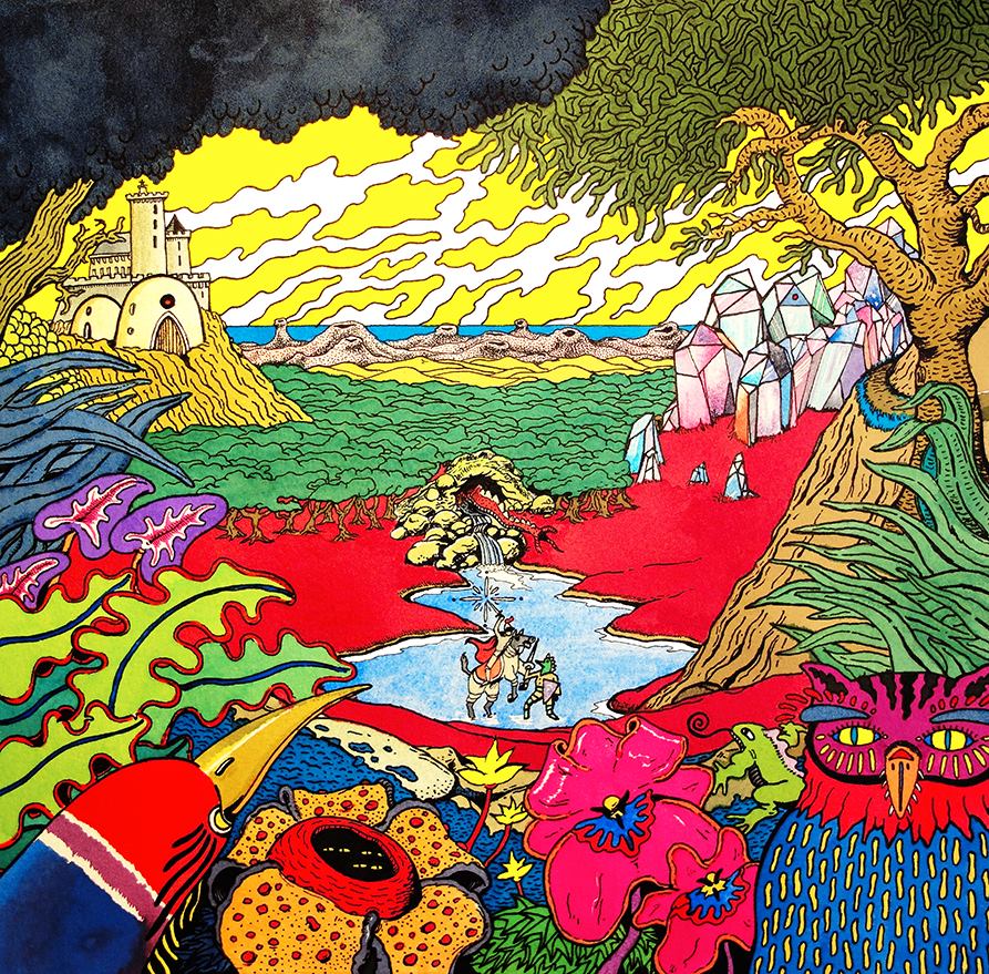 Proche du label FVTVR, Romain Lemé avait déjà tapé dans l’œil des amateurs de belles couvertures grâce à son travail pour le groupe Pégase (autre projet de Raphaël d’Hervez). Baignant dans une atmosphère chevaleresque, ses dessins se rapprochent des miniatures du Moyen Âge, avec ces coups de crayons subtils et précis suggérant une vision du monde et de l’univers empreinte de spiritualité, de fantaisie et d’une touche d’inquiétude.