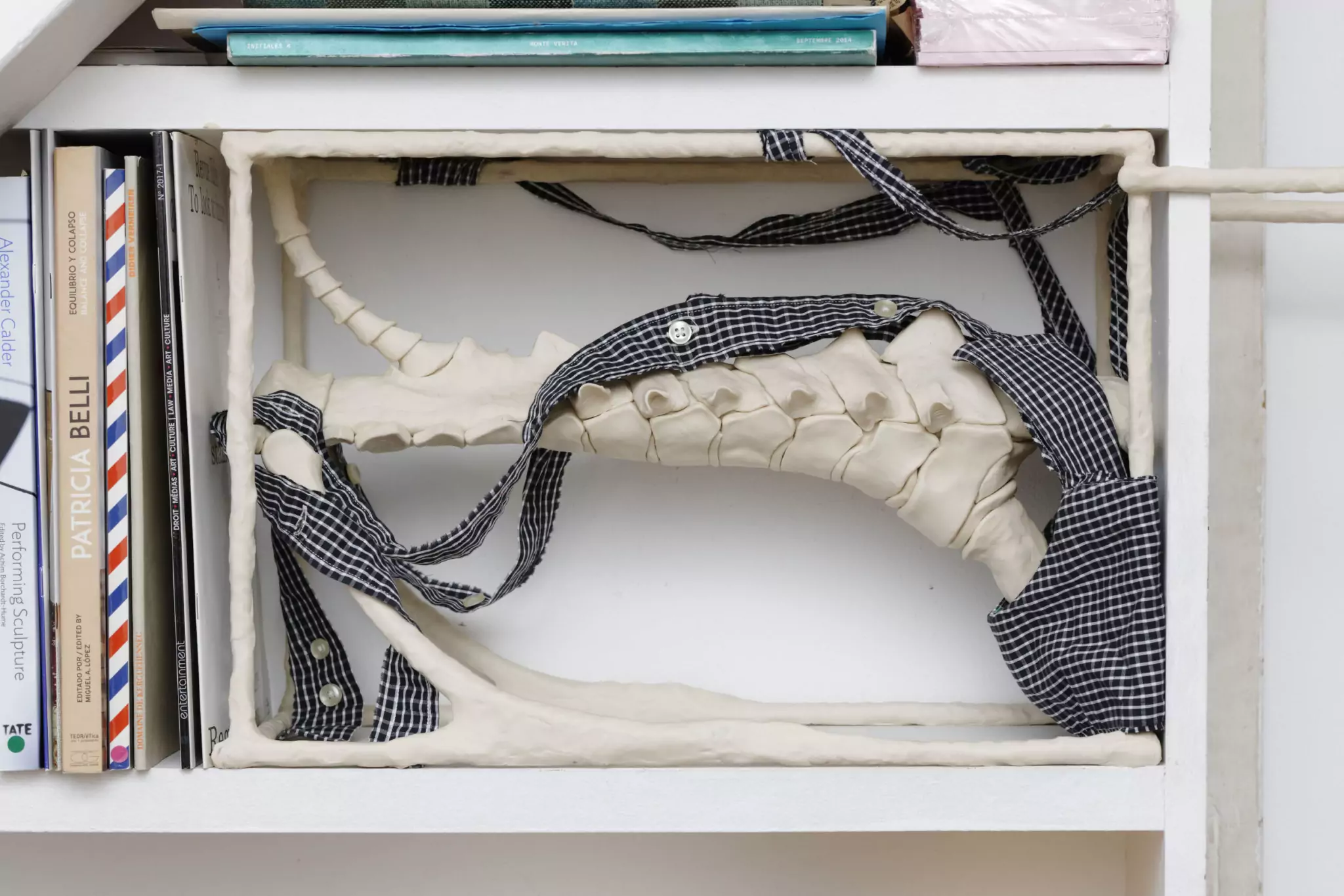 L’installation complète avait plusieurs régimes de visibilité. La structure osseuse passait une porte entrouverte, qui débouchait sur un espace interdit aux visiteur·ses. Cette porte était normalement fermée, elle séparait l’espace d’exposition des bureaux. Ça a été un petit bras de fer pour faire accepter qu’elle soit ouverte. Là, on passait un deuxième régime de visibilité, invisible pour les visiteur·ses. Elleux voyaient environ 60% du système osseux, qui ensuite passait par la cuisine de l’équipe, continuait de longer les murs et allait jusque dans les bureaux. Dans la partie bibliothèque des bureaux, il y avait une autre sculpture, faite uniquement pour celleux qui travaillaient là.