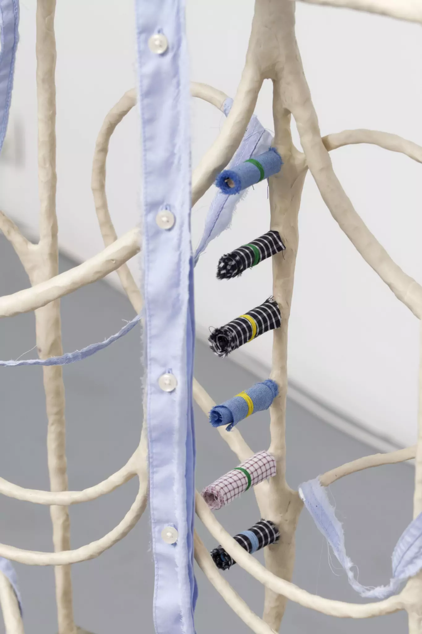 Oui, l’installation était un grand rhizome. Il commençait dans le premier espace de travail, celui de la personne qui accueille les visiteur·ses. Là, une première sculpture faite à base de manches de chemises, à l’intérieur, là encore, de tiroirs administratifs. La sculpture passait le long des murs, s’alignait, se contorsionnait et allait jusqu’à l’étage. À chaque fois, il y avait ces petites bobines de tissu, comme si elles étaient déplacées d’un casier à l’autre tout en étant scellées à l’ « os ». Dans le cadre de mon invitation, j’avais demandé à avoir accès aux archives de la Villa Vassilieff. La structure osseuse passait donc par différents casiers, notamment un rempli d’archives de la Sécurité sociale, liées en fait à la médecine du travail. La Villa Vassilieff était une structure architecturale mais aussi une structure de travail, c’est ce que j’ai essayé de formuler de cette manière.