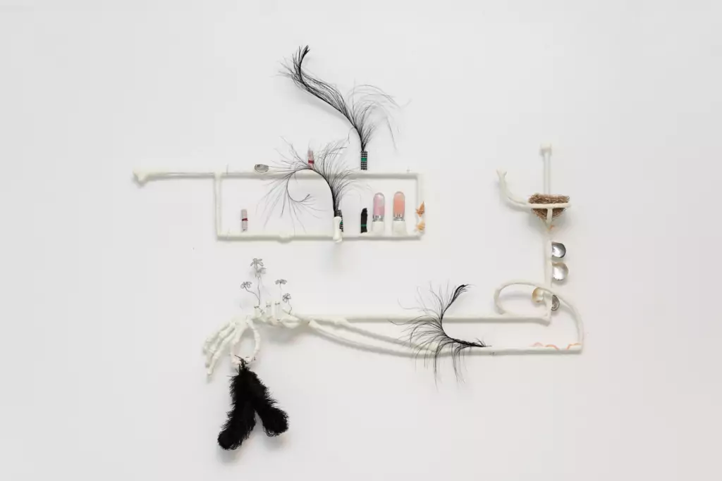 Ces os qui se contraignent à la fois à l’architecture et au contexte, c’est une métaphore des boîtes dans lesquelles les choses existent, où elles prennent forme. J’ai eu envie de continuer à travailler avec cette idée, mais pas forcément en lien avec un contexte violent en soi. Les Cabinets de contorsion deviennent des sculptures un peu plus autonomes. J’en montre deux pièces, plus récentes, à la Maison Pop, intitulées Who sold their skin ? Ce sont des systèmes clos, un peu comme un squelette, mais qui intègre des tissus, des coquillages, des gloss à lèvres, des plumes, enfin plein d’autres choses. L’idée, c’est de déterminer comment, avec quoi et contre quoi on se construit en tant que corps. C’est un peu moins anthropocentré aussi. Sur ces os, il n’y a plus de chair, plus personne, le squelette a déposé sa fonction, s’en émancipe et devient partie d’un système plus large. Les dernières sculptures des Cabinets de contorsion sont peut-être moins contextuelles, mais il y a toujours une contrainte, même en creux, dans le sens où elles deviennent des anatomies émancipées. Finalement, on peut voir la boîte comme un truc qui contraint, mais aussi qui protège, selon les boîtes ! (rires). Qu’est-ce que ce serait, l’anatomie émancipée d’un corps, par exemple, et qui doit vivre ? Sylvain Ménetrey a écrit un texte sur cette série : « Survivance du calcium » [accessible dans le portfolio de l’artiste, ndlr]. Il y a cette idée du corps contraint, comment ça peut protéger et comment ça se renverse. Il compare ces pièces à ces plantes d’intérieur qui se contraignent aussi aux murs etc., qui trouvent leur vie dans un espace qui n’est pas fait pour elles.