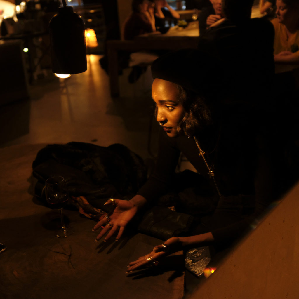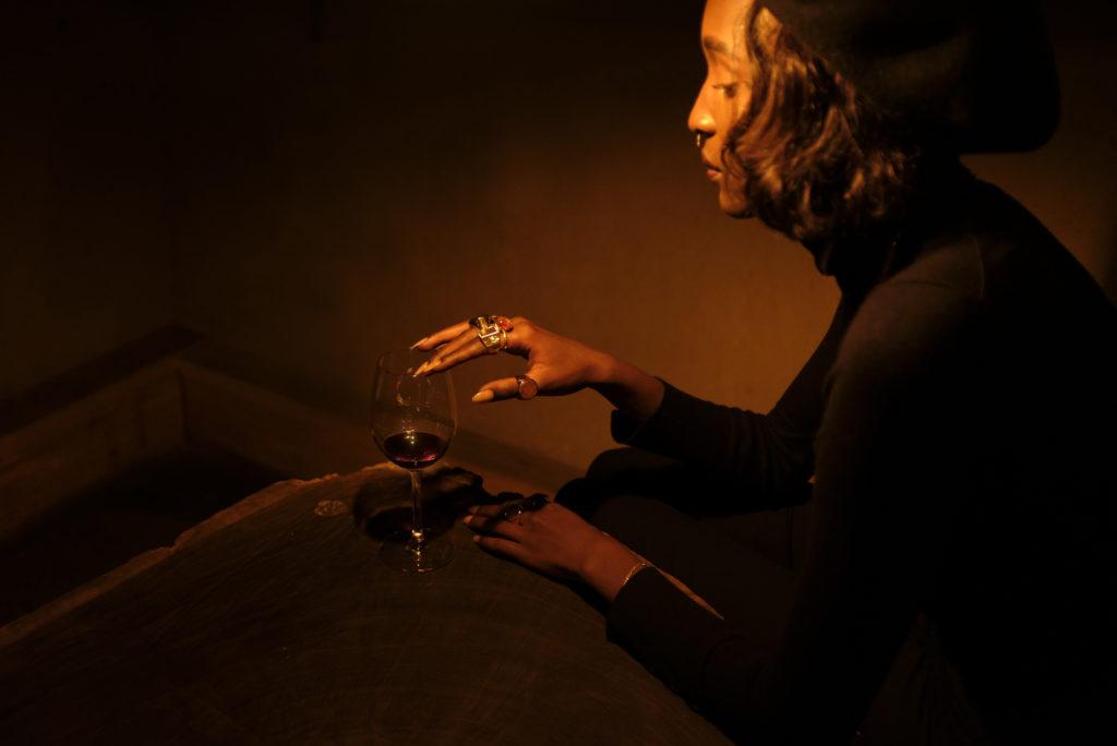 Lous préfère balancer des éclats de rire à la gueule de la vie. Elle est heureuse et s’extasie de tout : de la beauté des tables en bois, de ce verre de vin qu’elle savoure avec nous. La conversation glisse toute seule, on en oublierait presque pourquoi on est venues. On a parlé de sa passion pour le Japon où elle aimerait vivre, « à Hokkaidō, dans la campagne et loin du monde ». On a parlé films d’horreur, Lupita Nyong’o, potterie, féminisme, être noire, et le dire. Et puis, on a parlé de ce symbole qui est le sien : « Les mains levées vers le ciel ». Le dessin illustre son nouveau titre : « Dilemme ». Il représente un geste « d’extrême joie comme de lamentation », elle nous explique. Cette ambiguïté, « c’est tout moi, c’est ma vie ». Le jour où on la rencontre, elle l’a peint en doré sur son front. Alors, quand elle se réjouit de la sortie de son album, les yeux écarquillés et les paumes ouvertes, la mise en abîme cristallise l’instant dans un tableau un peu mystique. Morceau de discussion avec l’artiste.