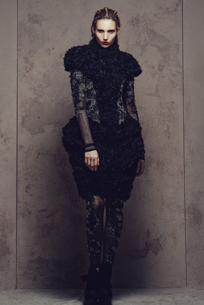 J’ai beaucoup galéré avant d’en arriver là, après le bac on m’a refusé toutes les écoles publiques de mode et je n’avais pas les moyens de faire une école privée. Plusieurs années plus tard, j’ai fait une formation de modélisme via l’AFPA, prise en charge par l’État. Ça m’a sauvé la vie. Par la suite j’ai lancé des mini-collections, rencontré des gens, gagné des concours… Et puis je suis venu à Paris pour me faire le réseau qu’il me manquait. En 2014 j’ai monté mon entreprise et j’ai commencé la première collection, « Noir », avec les masques brodés, dans laquelle j’ai mis mes dix années de galère, de frustration, d’envie… C’était une collection d’accouchement de l’âme. Pour la deuxième collection, « Rupture », on a eu une super salle, de super partenariats, on a commencé à travailler avec Swarovski, ou encore les denteliers de Caudry. Après cette collection, toutes les portes se sont ouvertes. On a travaillé sur un triptyque autour du noir sur les trois premières collections. Là on va surement travailler sur un nouveau triptyque plus axé sur le graphisme, avec un revirement au niveau du style. Même si on restera sur les couleurs maîtresses de l’âme de la Maison – le noir, le blanc, le rouge – ce sera beaucoup moins dark et plus lumineux.