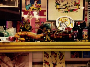 Deux tatoueurs, accoudés au comptoir semblable à celui d’un pub se tournent vers moi : « Hey, how are you doing ? » « I’m fine, and you? » « Great! ». Les yeux imbibés de couleurs, de tattoos vintage typiques américains, de corps de pin-up que l’on se grave sur la peau, d’aigles, de papillons, d’indiens et de dragons, je complimente les tableaux et peintures murales. « Thank you! Are you on vacation? », me répondent-ils. « I’m in internship for six months » « Oh nice, where? » « In an art gallery not so far! » « That’s cool! As you see this place is between an art gallery and a tattoo shop! Our boss opened it in the sixties, he’s eighty years old now but he still tattoos people sometimes! ». Je les remercie, leur dis à bientôt, que je repasserai à l’occasion.