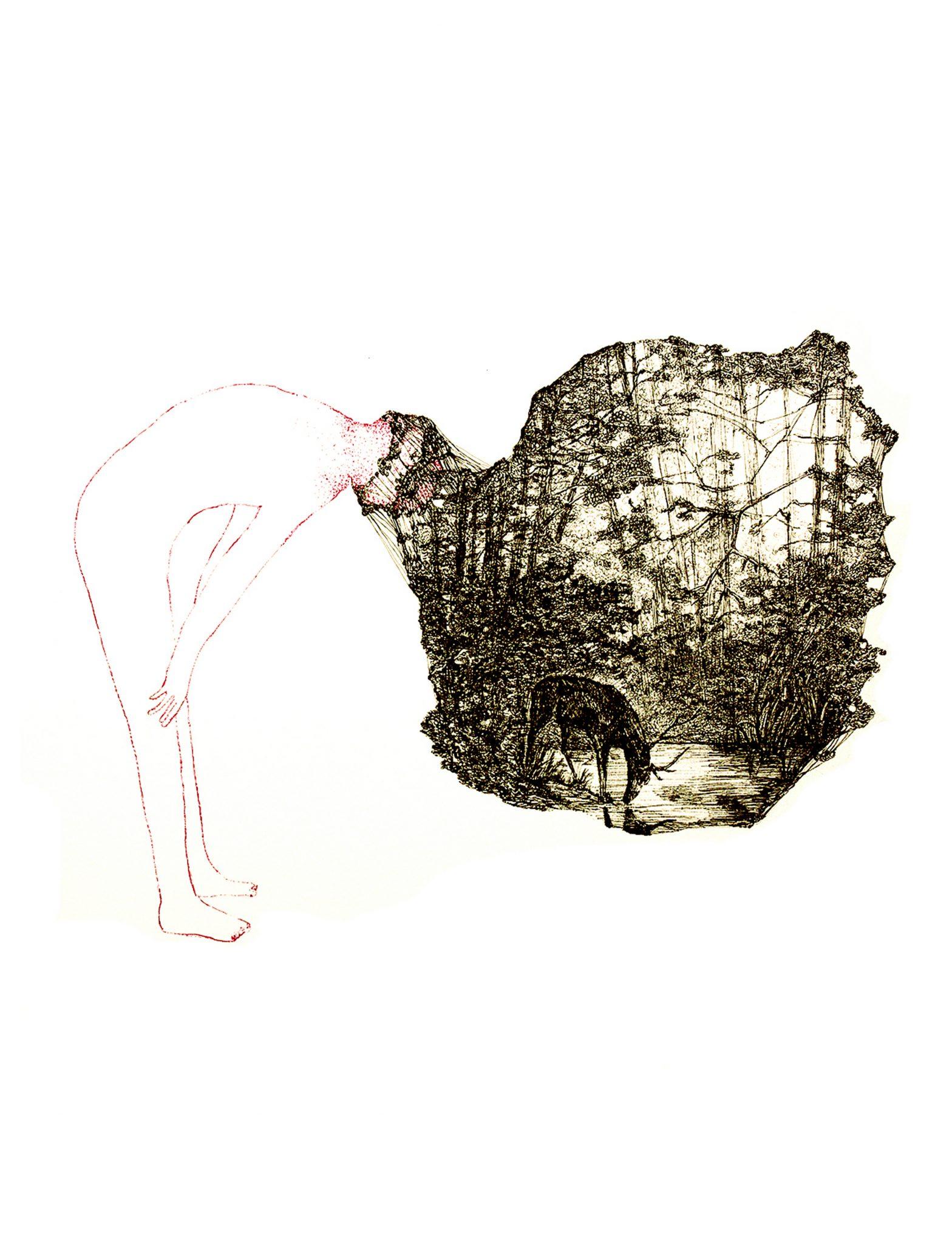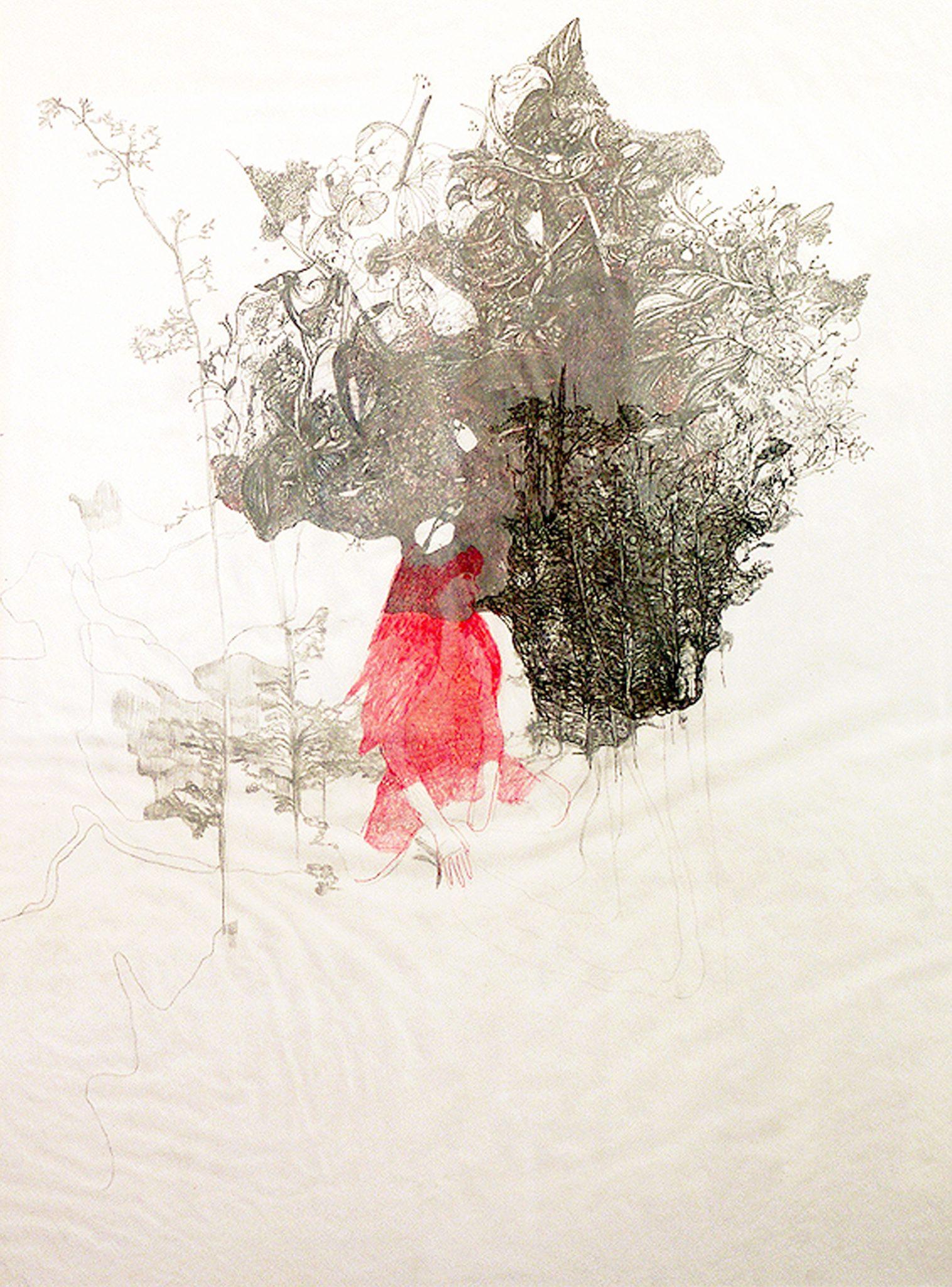 Une photographie panoramique est agrandie pour l’exposition à la galerie. Cette image qui hante l’artiste depuis deux ans a donné lieu à toute une série de travaux autour d’arbres qui restent en suspens dans l’espace de la feuille. « Les lignes qui sont autour signifient l’espace qui aurait pu être plein mais qui est resté vide » nous dit Nathalie. Selon Deleuze, une toile n’est jamais vide et une page n’est jamais blanche avant d’être remplie : elle est déjà pleine, pleine du pire…