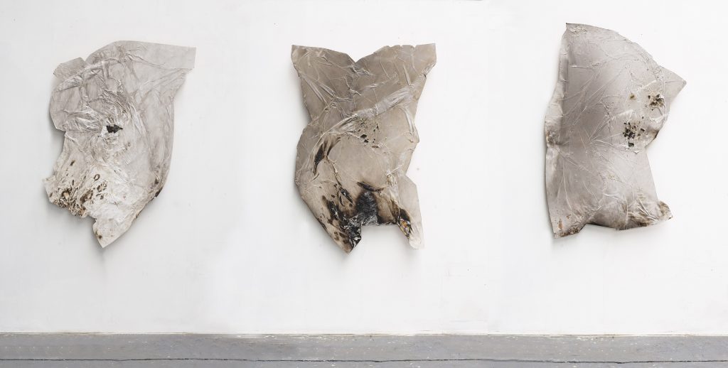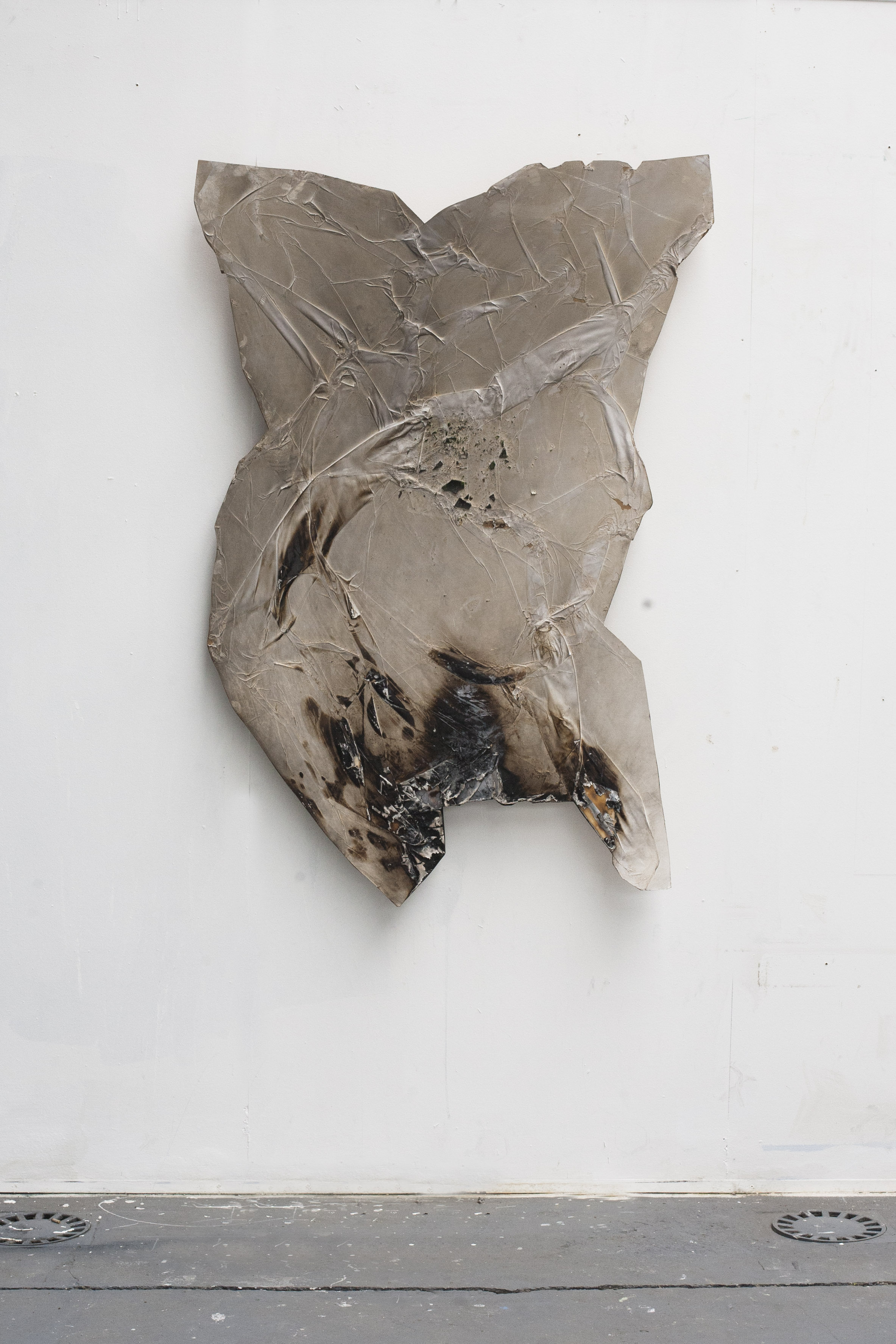 On remarque une confusion parallèle dans la série d’œuvres Esperanto (2015 et 2016). En lien aussi avec l’état d’urgence, les œuvres sont faites à partir d’affiches de manifestations vierges, transformées sous l’effet des cocktails Molotov lancés par l’artiste.