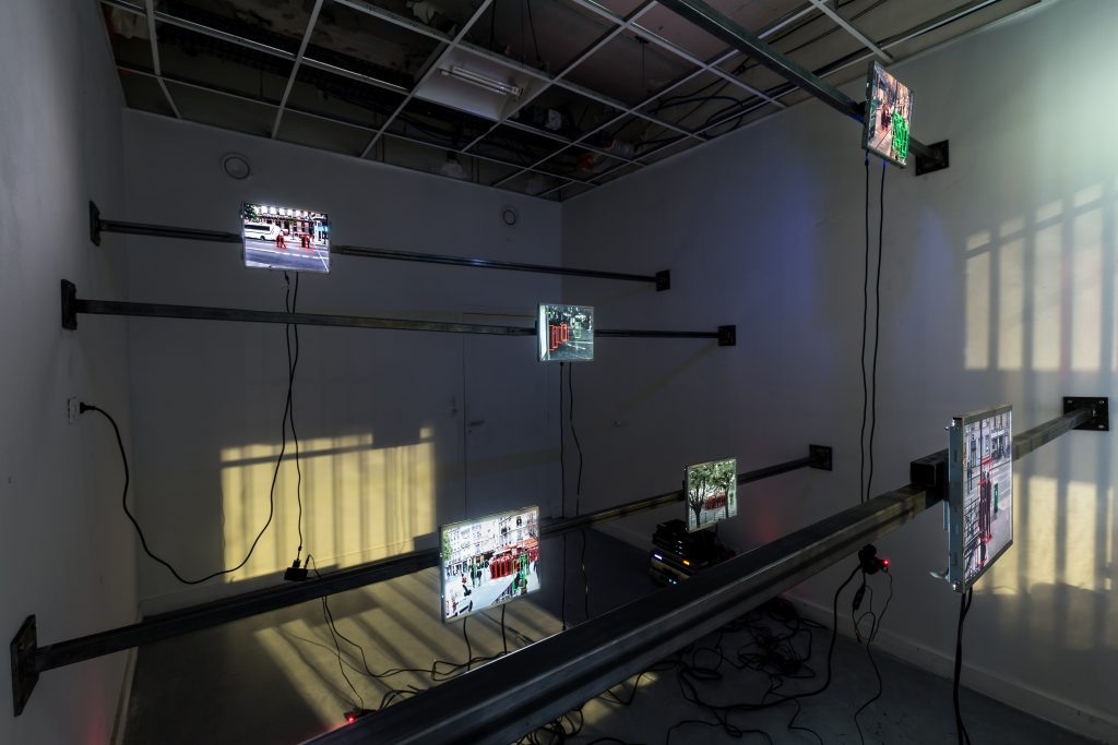 L’installation De la surveillance aux surveillés est composée de six écrans qui nous font face. Ils diffusent les vidéos de groupes de CRS immobiles en train d’encadrer des manifestations enregistrées à six mètres de haut, comme des vidéosurveillances. Un algorithme de détection des comportements anormaux ressemblant à ceux des forces de l’ordre est appliqué aux images, créant des cadres verts, puis rouges, pour marquer le danger… et le rouge n’encadre que les policiers !