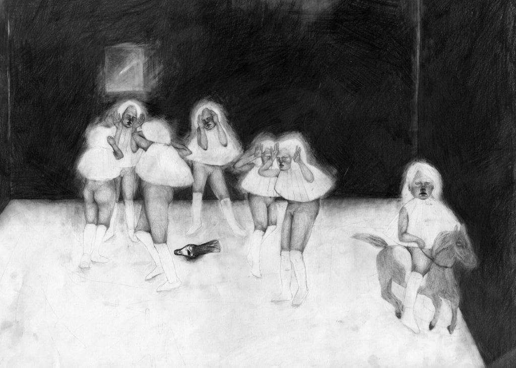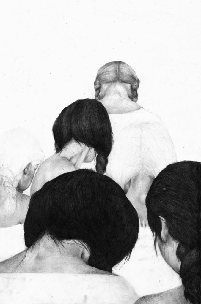 J’ai testé plein de techniques. Mais c’est le crayon, la mine de plomb et la gomme qui m’ont attirée. Il y a déjà tellement à faire avec ça – j’aime me concentrer sur une chose et explorer toutes ces possibilités. Je ne fais que du noir et blanc, sauf quand je fais de la photo. J’ai des images en tête et à partir de cela, je construis des compositions pour illustrer l’invisible.