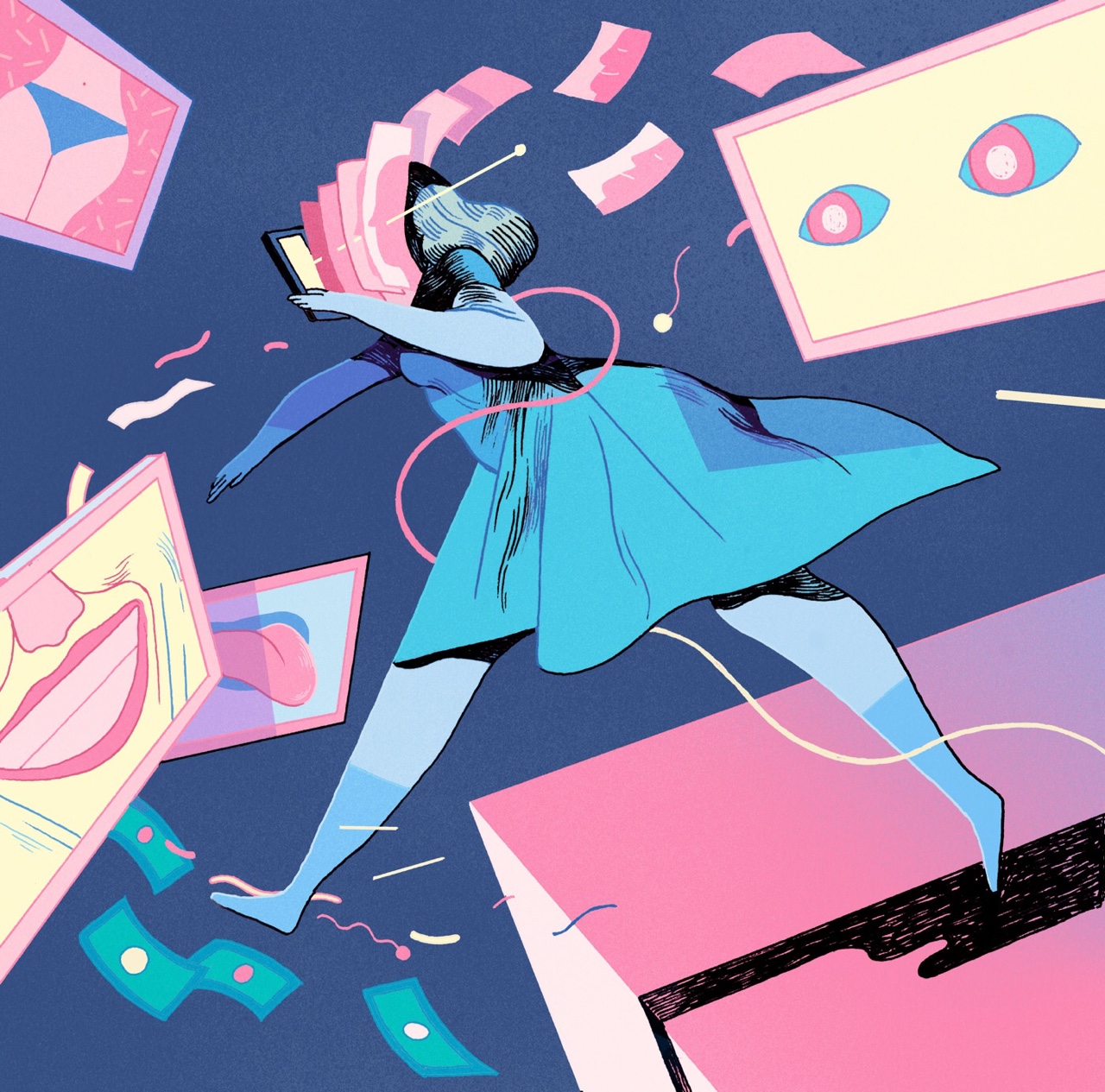 Ses illustrations, parfois en noir et blanc, parfois hautes en couleurs, sont fortement marquées par des jeux de tons et de perspective où les personnages fantomatiques qui les composent semblent se perdre dans une inconscience obscure. Autour d’eux, des écrans de télévision, des smartphones, des tablettes et des objets de tous les jours volent en éclats et apportent à l’image tout son mouvement.