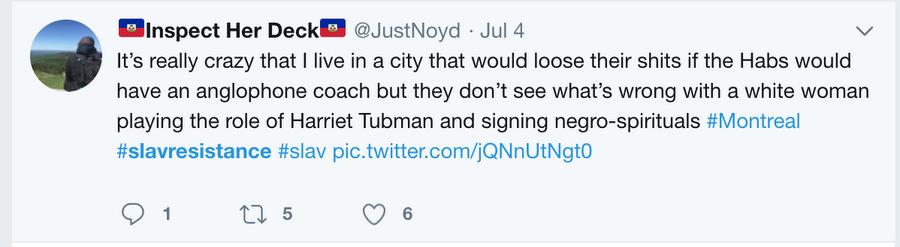 Au cœur de la polémique, la programmation d’une pièce de théâtre musical, SLAV, lors du Festival international de Jazz de Montréal, mettant en scène des chants d’esclaves noirs interprétés par Betty Bonifassi, une chanteuse française blanche. S’ajoute à cela que le metteur en scène de la pièce n’est autre que Robert Lepage, un des plus grands metteurs en scène québécois, lui aussi blanc, accompagné par une production et des acteurs eux aussi blancs. C’est un papier de Marilou Craft, une bloggeuse culturelle québécoise, écrit 6 mois auparavant à l’annonce du projet, qui a mis le feu aux poudres. Elle y dénonce un spectacle de pure appropriation culturelle qui, par l’absence de personnes de couleurs dans la production, détourne la réalité historique, donc les dynamiques raciales inhérentes à l’esclavage. Or, en s’appropriant le passé et la culture de la communauté noire afin de la dé-racialiser, le spectacle figure bien un ‘white-washing’ de l’Histoire. Malgré la défense de Betty Bonifassi, qui maintenait : « I don’t see color ; to me, it dœsn’t exist, physically or in music […]. All cultures and ethnicities suffer the same », une manifestation a eu lieu lors de la première du spectacle.