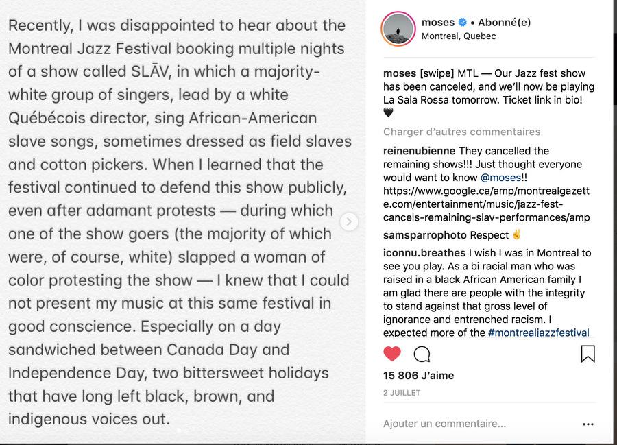 La pression est d’autant plus importante lorsque que Moses Sumney, chanteur afro américain programmé au Festival de Jazz, annule sa performance le 2 juillet en soutien au mouvement anti-SLAV. Un collectif, « Songs for Betty », est aussi créé en réaction au spectacle, afin de promouvoir l’art des personnes de couleurs, et le hashtag #slavresistance est lancé. La couverture médiatique prend dès lors une ampleur telle que le spectacle est annulé après quelques représentations. Une atteinte à la liberté d’expression artistique est invoquée par Robert Lepage, mais les voix de ceux défendant le besoin criant de diversité au théâtre et de valorisation des histoires des noirs sont les plus fortes.