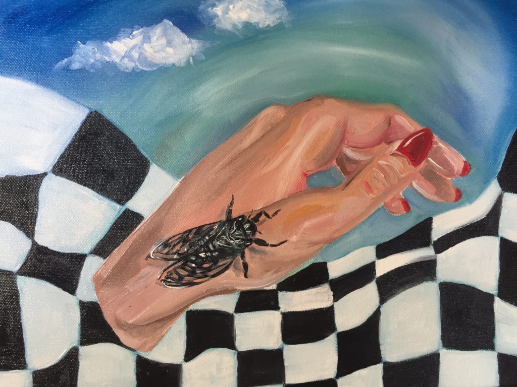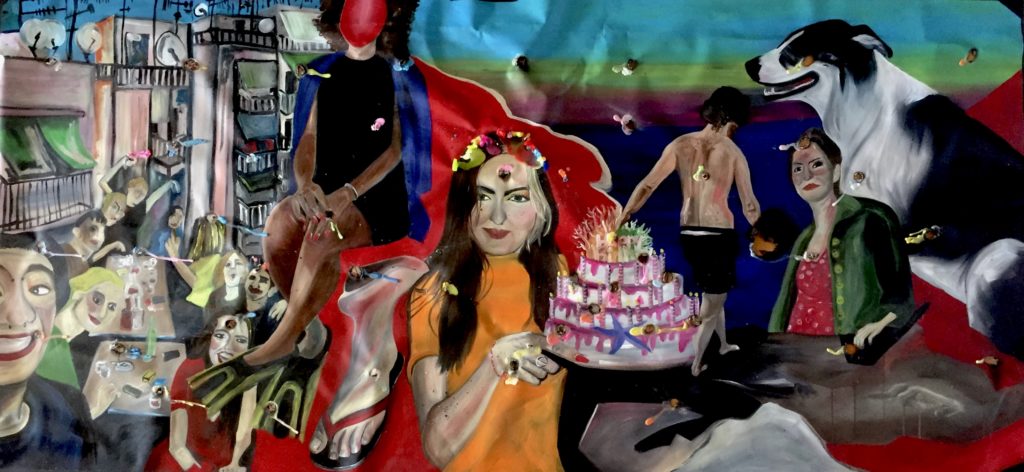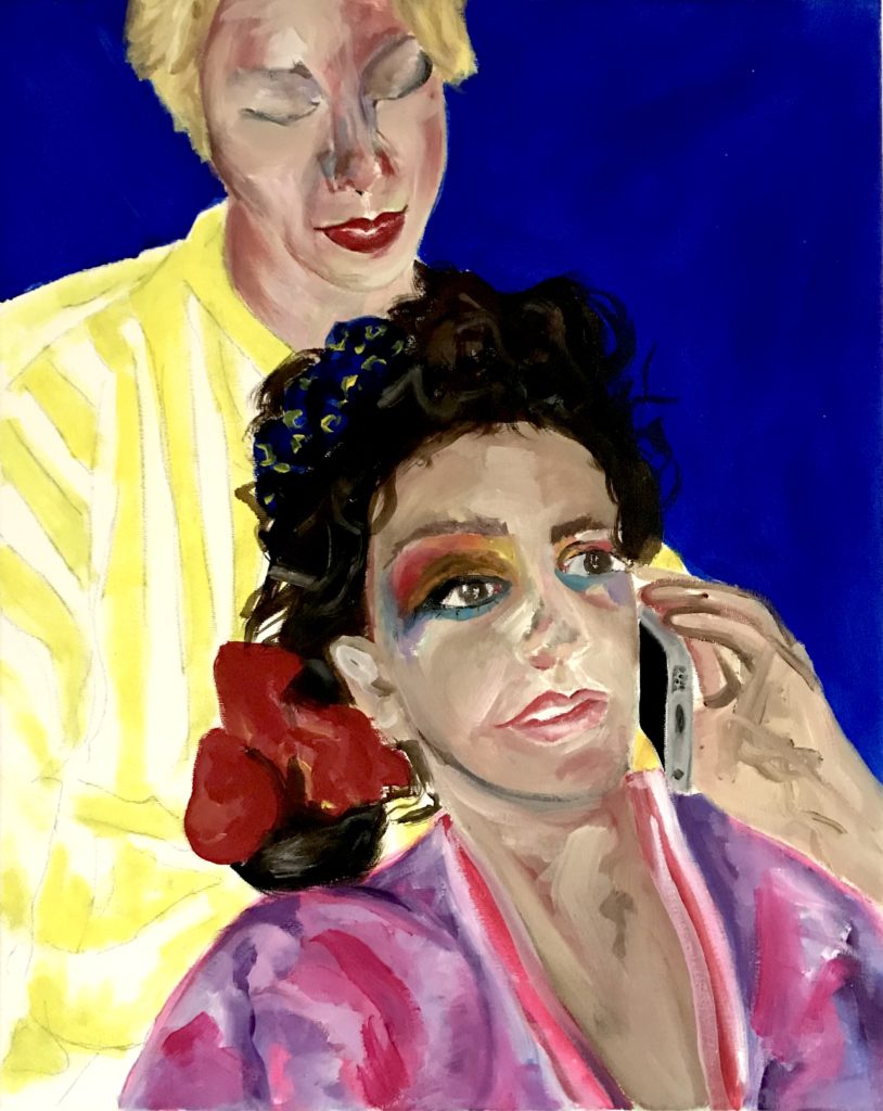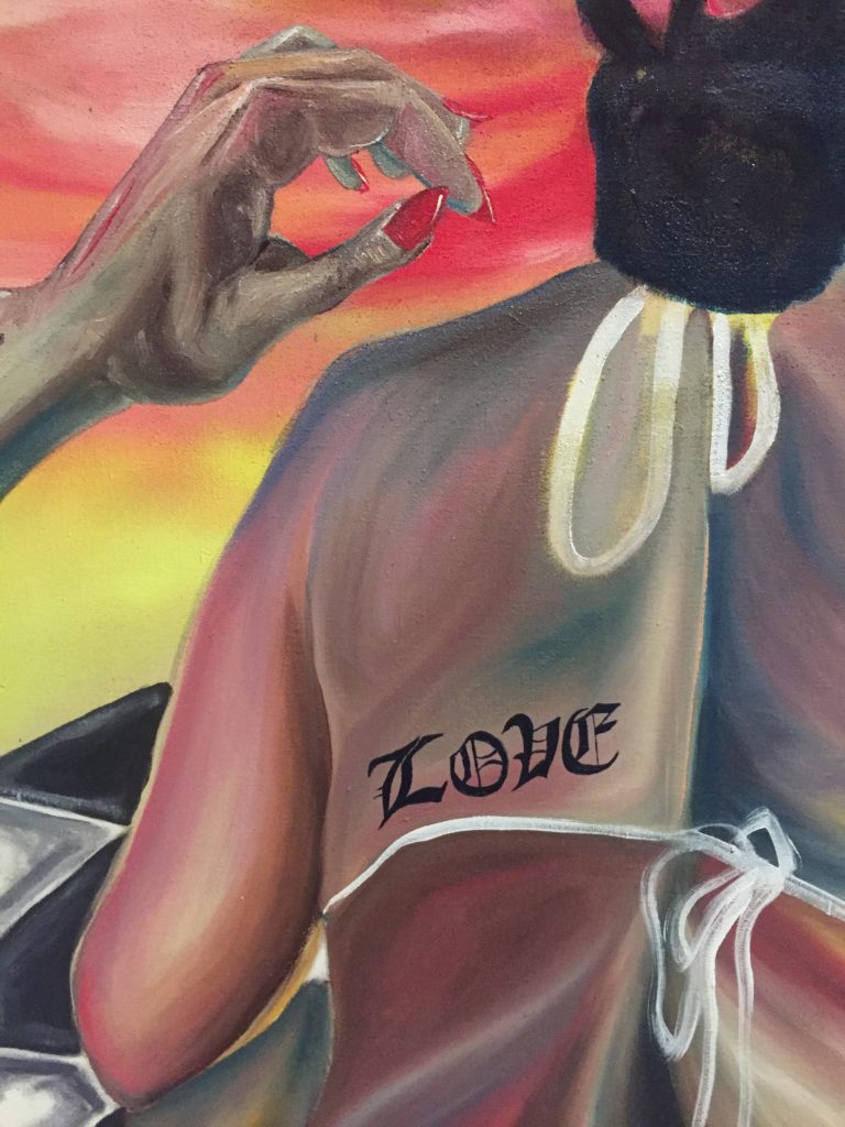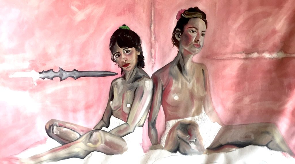Oui, je me mets dans la situation dont j’ai rêvé. Mais ce « moi » n’est pas vraiment non plus partie prenante de la scène du tableau. Il participe extérieurement. Oui c’est un peu comme se prendre en photo, je prends pas mal de selfies d’ailleurs. C’est comme quand tu es petite et que tu te regardes dans un miroir : tu te poses la question de savoir si les autres te voient de la même façon que comment toi tu te vois. Avec la peinture je me suis créé ma propre image, celle que je veux donner aux autres, c’est une réappropriation de mon corps.