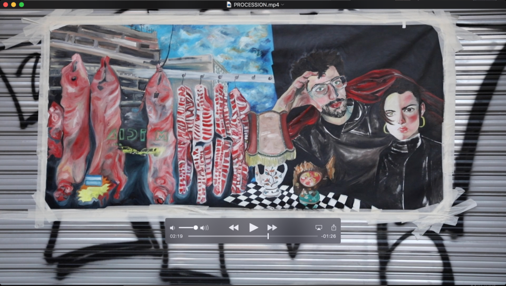 C’est une thérapie. C’est un moyen de dialoguer avec les autres. Je voudrais qu’en passant devant mes tableaux les gens se disent « ah oui je vois ce qu’elle a voulu dire ». Une sorte de partage. Et c’est pour ça que j’ai rajouté de la performance. Là j’ai récupéré Procession. Je pense que je vais la brûler, je voudrais que cette toile parte définitivement.