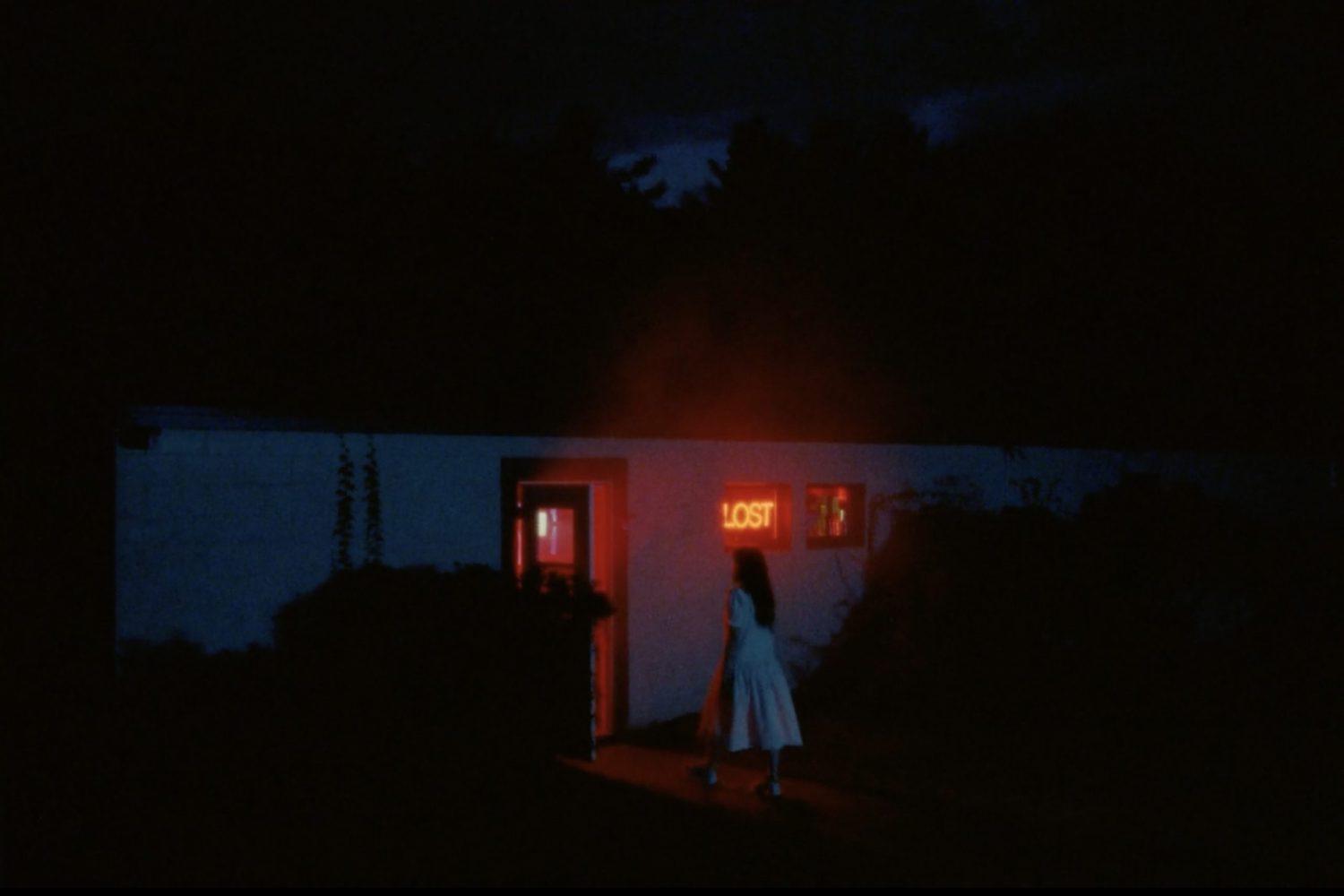C’est l’actrice Kristina Esfandiari, le regard brûlant et droit, qui campe le personnage principal de cette épopée. Baskets ensanglantées, innocence apparente et désir de fuite en ligne de mire. Sa figure centrale vient faire écho à la partie documentaire du film dans laquelle on suit le duo Boy Harsher en production / live. Jae Matthews vient alors laisser entendre une forme d’identification face à la détresse de cette femme perdue et tourmentée qui n’arrive pas à aller contre ses pulsions destructrices. Cette construction en deux parties parallèles – entre live et fiction – crée une imbrication judicieuse. La musique s’invite par les médiums mis à disposition dans le décor de l’intrigue, comme les écrans cathodiques ou des enceintes. Un monde à la fois proche et lointain.