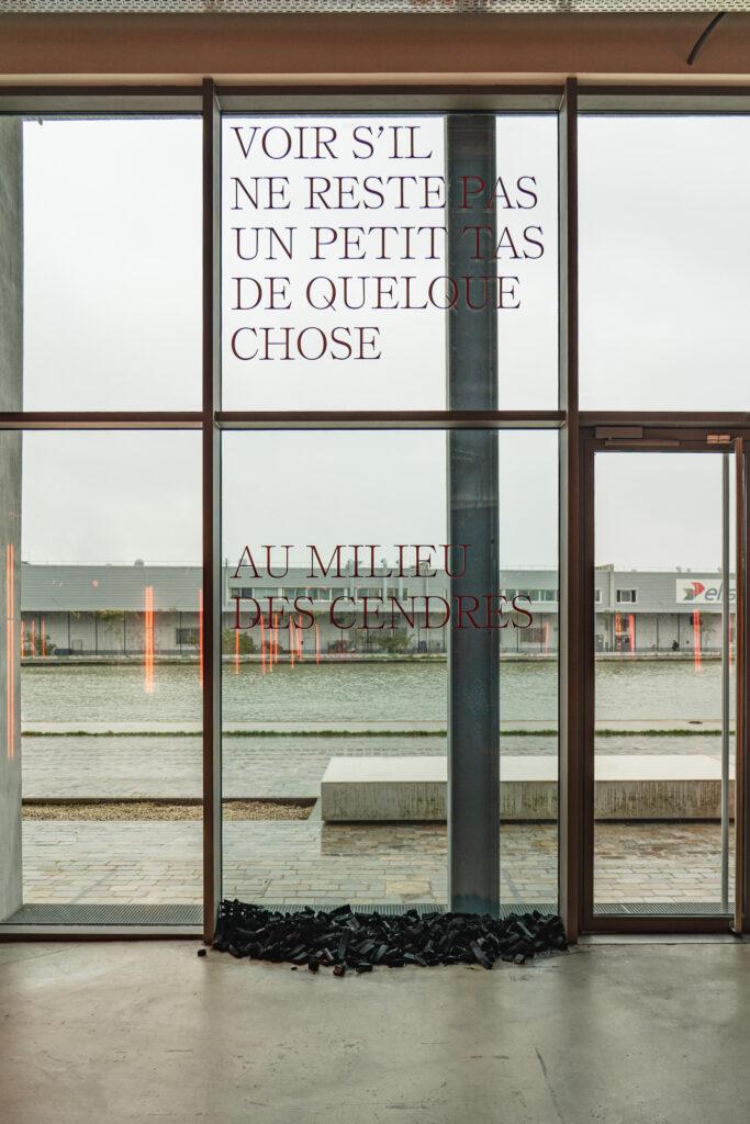 Ce sont les mots de la plasticienne qui nous accueillent à l’entrée de l’exposition. Quelques feuillets imprimés sur de simples papiers A4 blancs nous racontent les incendies, l’évacuation des personnes vulnérables, le vécu des foyers. Derrière, la pièce ouverte sur le canal avec ses larges baies vitrées, accueille un travail plastique multiforme qui se veut une émanation de ce récit. C’est à la fois trash et glossy. Des cadavres de cyprès côtoient des tas de charbon pailletés. Des crépitements et une lumière orangée rappellent la fureur toujours proche du grand feu. Les jeunes artistes, Mégane et les révoltés du foyer Sonacotra de son enfance sont tous et toutes uni·es par le feu, qu’il soit acte vengeur ou énième épreuve de l’exil. Des souvenirs du squat ou du foyer jonchent le sol. Sur un tas de cendre, une boîte de riz distribuée par la Banque Alimentaire, avec pour seule description trois grosses lettres – RIZ – imprimées sur le carton bleu, blanc et rouge. Ce marqueur de la précarité, il n’y a que ceux qui l’ont vécu qui peuvent le comprendre. Six chaises entourent des tas de charbon, c’est la présence en creux des co-auteur·ices. Assis·es sur ces objets transformés en comètes incandescentes avec du simple ruban, on se retrouve face à un horizon de cendres et de violence. L’idée directrice du collectif est omniprésente : montrer ce qu’on a tellement l’habitude d’ignorer, forcer le regard sur les choses terribles, celles que l’on préfère oublier. Ici, le gyrophare de la police et le chausson d’enfant Spiderman aux couleurs tricolores nous parlent de la violence des expulsions, des dysfonctionnements systémiques français. Ailleurs, une perceuse tourne dans le vide, rappelant le bruit des portes que l’on scelle après une expulsion. Au milieu de l’espace, suspendus à la colonne de béton, des audioguides. Dedans, vous trouverez les voix des 6 co-auteurs qui racontent leur histoire de feu.