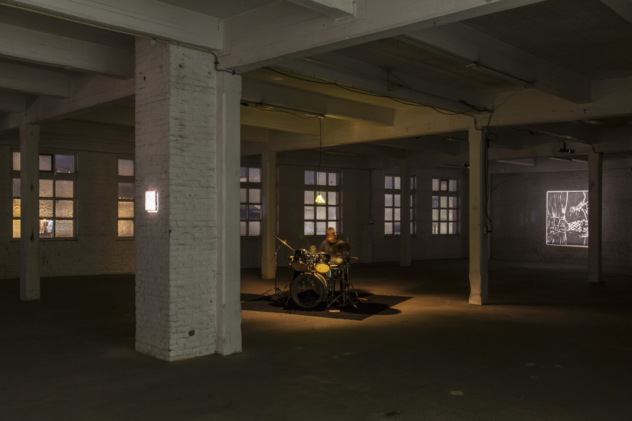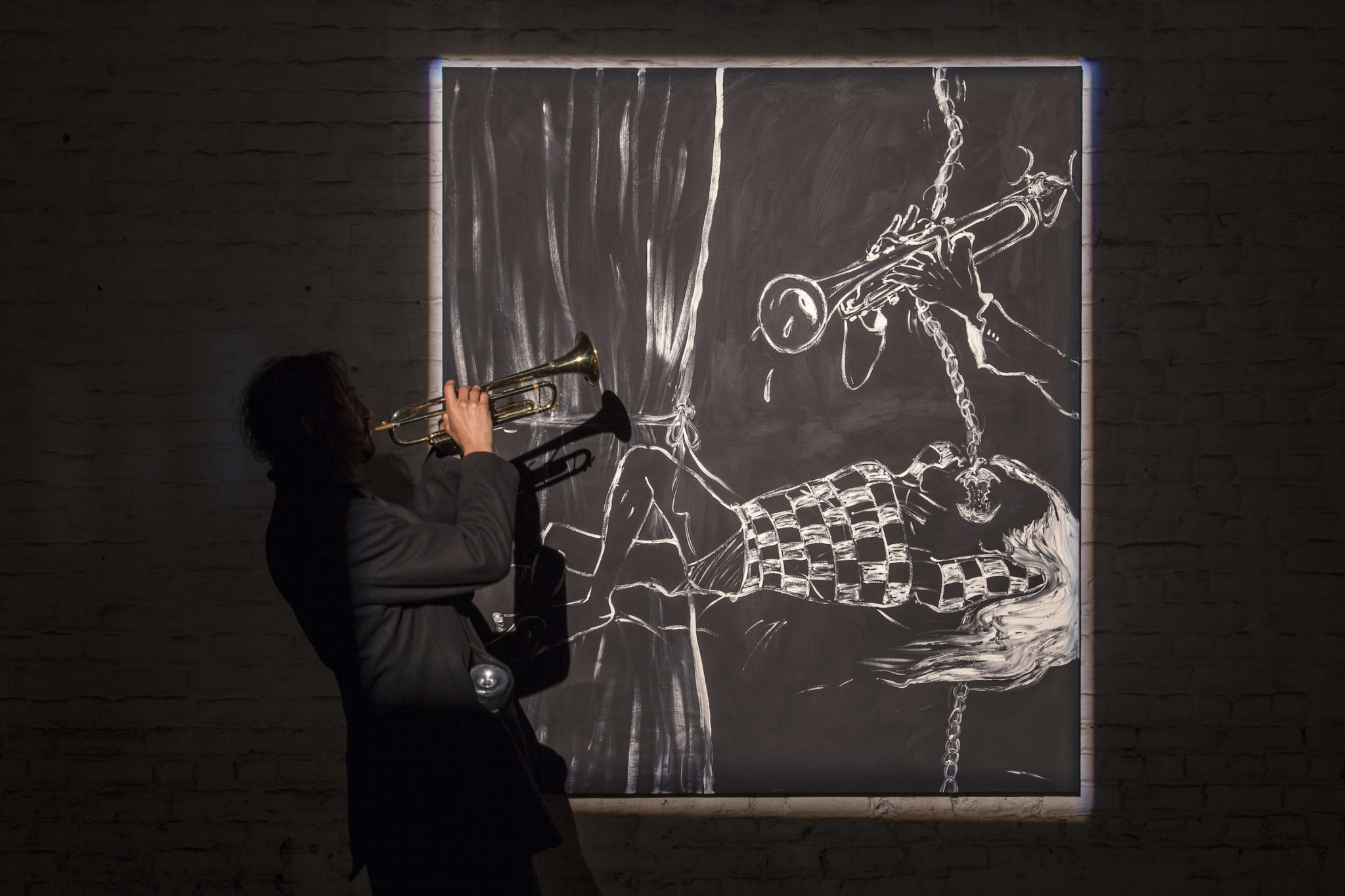 D’un autre côté, la théâtralité nous sort de cette mélancolie. La batterie ce n’est pas très glauque non plus, c’est rythmé à fond. Avec Daniel, on avait pensé à des morceaux par rapport aux peintures et Charlotte arrivait avec sa voix lyrique entonnant des chants de chambre devant les peintures. Je voulais vraiment rejouer les codes comiques du théâtre. La montée d’escalier, le trompettiste en costard trop grand, cette femme en costume qui vient chanter des chansons d’amour… tout était un peu surjoué. Il y avait aussi l’image du crooner qui s’assoit à sa batterie, sous les lumières jaunes. Tou·te·s ces personnages auraient très bien pu être dans les peintures, ielles font des liens, les expliquent, les chantent, les jouent.