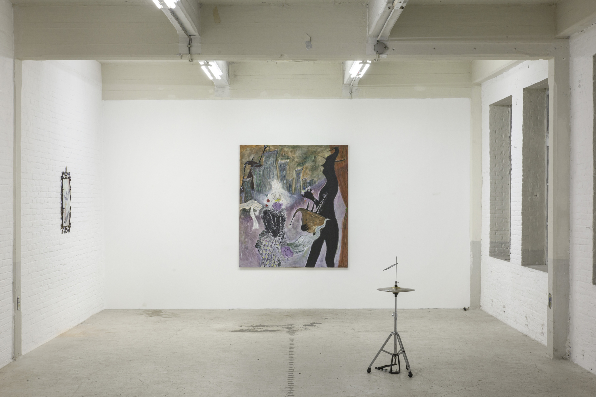 La physicalité de l’instrument m’inspire beaucoup pour les formes dans les peintures. Les cuivres particulièrement. La forme d’une trompette, d’un saxophone… Je prépare des projets dans lesquels j’aimerais travailler avec une chorale, un orchestre. Il y avait aussi toute une époque où la peinture et la musique communiquaient beaucoup entre elles. Beaucoup de musicien·ne·s faisaient des pièces en réponse à de la peinture, cette période un peu old school peinture-musique, jazz. C’est aussi ça que j’ai voulu rejouer à la Brasserie Atlas. J’ai invité Baptiste Le Chapelain à intervenir avec trois peintures. C’est un bon ami et surtout un artiste dont j’adore le travail, principalement musicien sous le nom Apulati Bien. Nous partageons dans la peinture un attrait pour un univers assez spectral. Il a beaucoup aidé à penser et concevoir l’exposition.