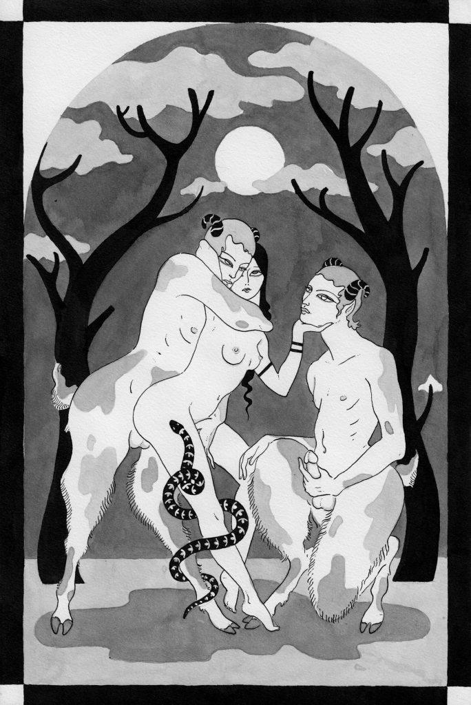 Manifesto XXI – Les inspirations de ces illustrations semblent être nombreuses. Je vais donc essayer de les démêler. D’abord, il me semble que votre univers est nourri de références à la mythologie. On pourrait y voir des fêtes dionysiaques, des récits de faunes et de nymphes…