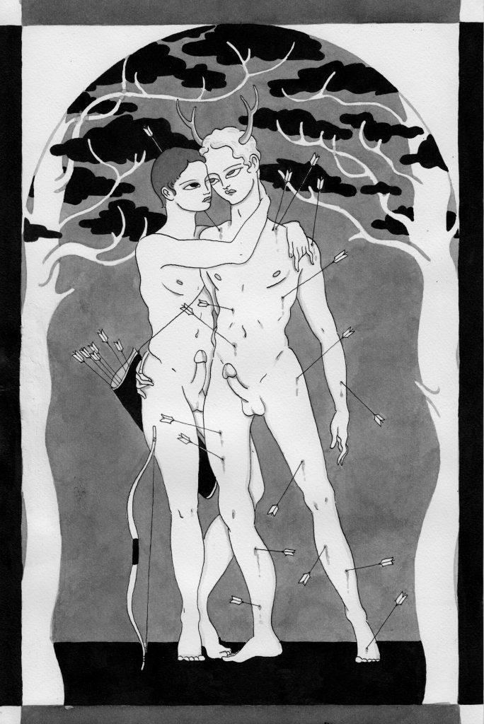 Et la religion dans tout cela ? Les dessins sont inscrits dans des alcôves, et à plusieurs reprises j’ai vu une iconographie chrétienne, du martyre de saint Sébastien à la Pietà de Michel-Ange.