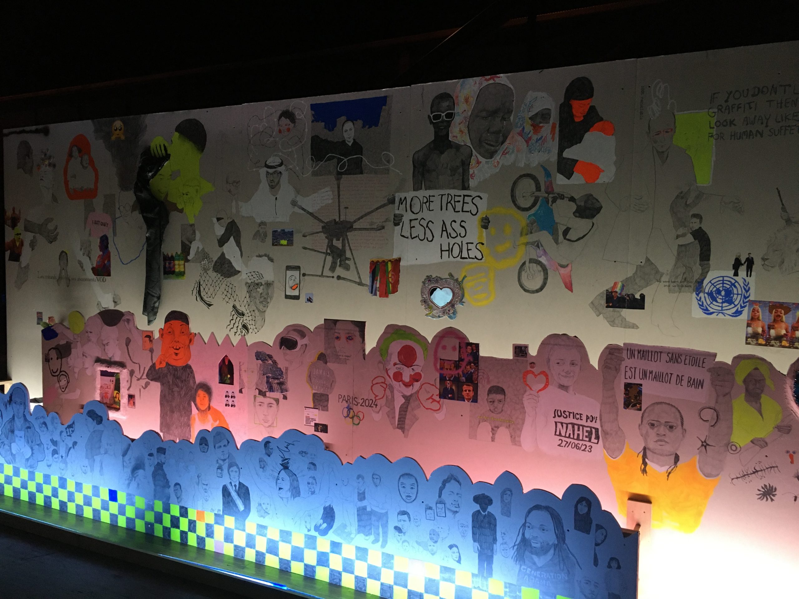 Lina Goudjil mêle peinture, dessin et objets du quotidien pour créer une fresque politique et satirique sous forme de frise à trois niveaux. Des personnalités publiques ou politiques aussi variées que Zinédine Zidane, Emmanuel Macron ou Bisan Owda, côtoient des messages de contestation parfois humoristiques – sur les violences policières, le graffiti, l’écologie… Mobilisant le flux incessant d’informations et d’images auxquelles nous sommes confronté·es, l’œuvre de Lina Goudjil peut résonner auprès de tout·e un·e chacun·e. Notre regard s’attache à un dessin puis est appelé par un autre, ainsi, une histoire se crée, celle de notre société contemporaine. Les visages y sont vivants et expressifs, ce qui rend l’installation dynamique et captivante.