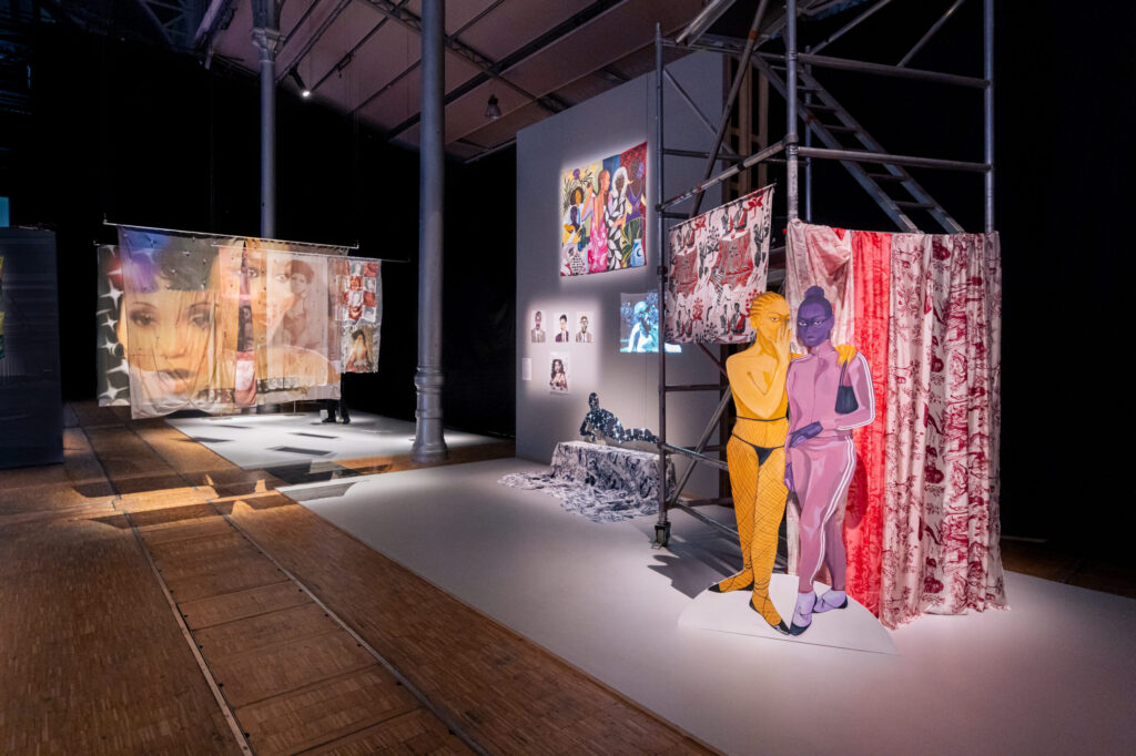 Dans son installation Elle brille dans le noir, Maty Biayenda célèbre les récits occultés des personnes trans et racisées. À travers des portraits textiles, elle donne vie à ces histoires fragiles d’idoles ou de personnes inconnues. En détournant la toile de Jouy française, elle pointe du doigt le passé colonialiste et la fétichisation persistante des corps racisés. Maty Biayenda fusionne habilement passé et présent, fiction et réalité. Son travail explore les frontières mouvantes de l’identité et de la désirabilité, confrontant le fétichisme véhiculé par le male gaze par la réappropriation des stéréotypes. En ouvrant de nouvelles voies pour la représentation et la reconnaissance des figures trans et noires, Maty Biayenda invite à une réflexion sur l’histoire, la mémoire collective et l’identité.