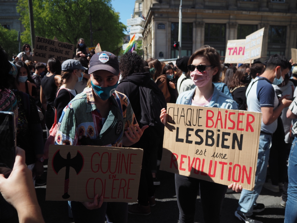 Il est 16h et la foule remonte le boulevard Sébastopol dans le calme. Les manifestant·es avaient des raisons d’appréhender ce défilé dans la capitale. En effet, en plus du climat homophobe ambiant, les lesbiennes lyonnaises ont été menacées la veille par des militants d’extrême droite qui ont tenté d’empêcher la marche. En amont de la manifestation parisienne, les colleuses organisatrices nous le rappelaient encore une fois : « En général, on continue, nous les lesbiennes, d’être violentées dans toutes les sphères de nos vies (santé, emploi, espace public). On continue de lutter pour nos droits d’une part, et aussi contre la montée du fascisme de ces dernières années. »