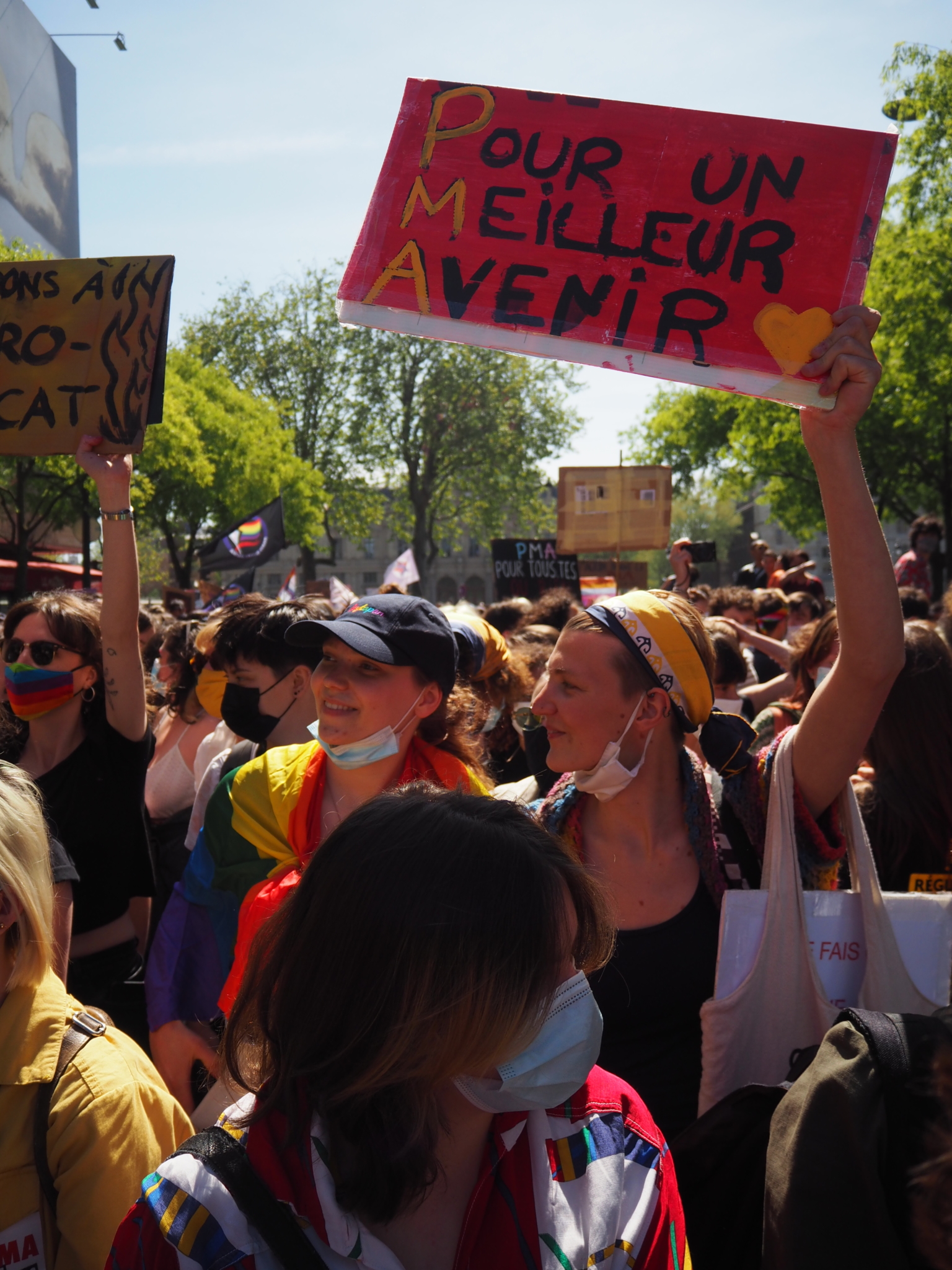 Au fil du temps, le cortège coloré grossi pour bientôt ressembler à une soirée club kid militante, entre revendications scandées aux microphones, groupe de batucada et mini sound-systems improvisés. De quoi redonner le sourire à Adé, personne lesbienne queer et trans, rayonnante dans sa robe noire, assortie d’une pancarte « Dyke Power » : « Ça me fait plaisir de voir autant de belles personnes dans la rue. Ça me donne beaucoup d’espoir et d’amour. Et l’amour, on en a besoin en ce moment ! »