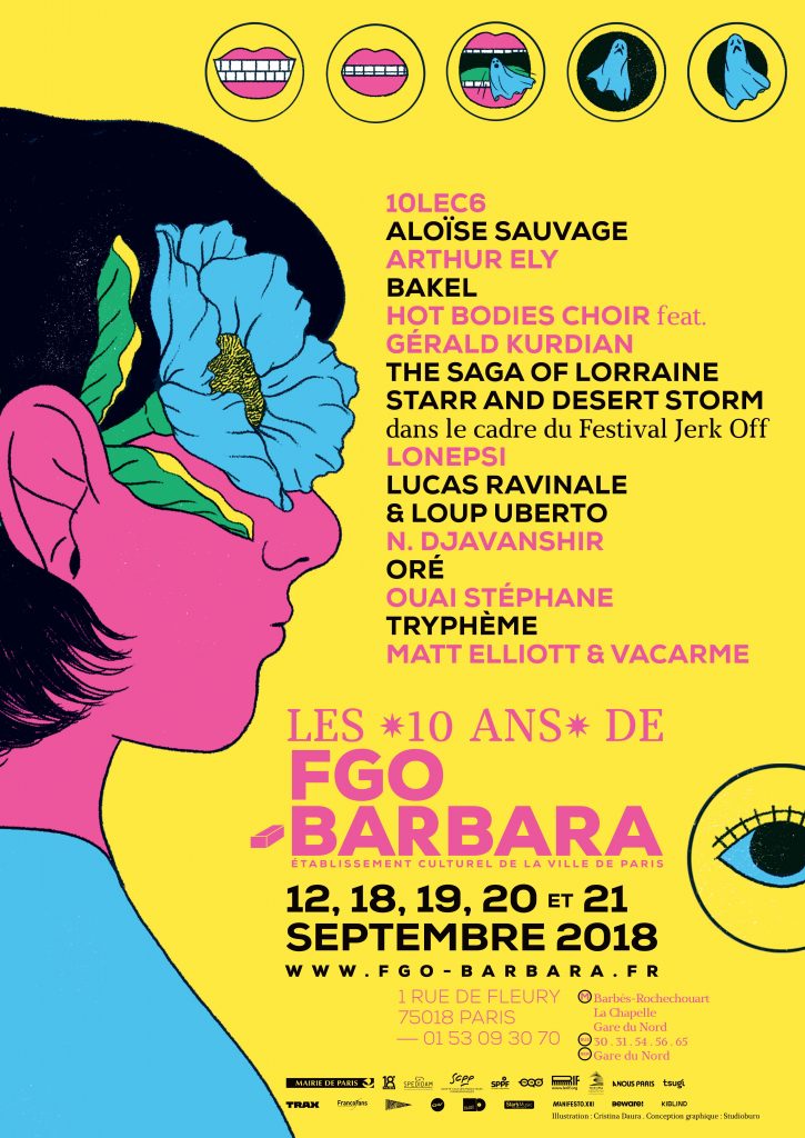 Pour cet anniversaire tout particulier, le FGO-BARBARA prévoit cinq jours de fête les 12, 18, 19, 20 et 21 septembre. L’occasion de voir sur scène les petits poulains en résidence MATT ELIOTT & VACARME, la création home-made by FGO de la chorale féministe Hot Bodies Choir (feat. Gérald Kurdian), le DJ immobile Ouai Stephane, les punchlines saccadées et les refrains entêtants d’Aloïse Sauvage, l’afro-house 10LEC6, le rap prosé de Lonepsi… Pour couronner et compléter le tout, la superbe exposition de Nicolas Djavanshir « Punk, Love and Kindness » sur la scène punk émergente Birmane sera également présentée.
