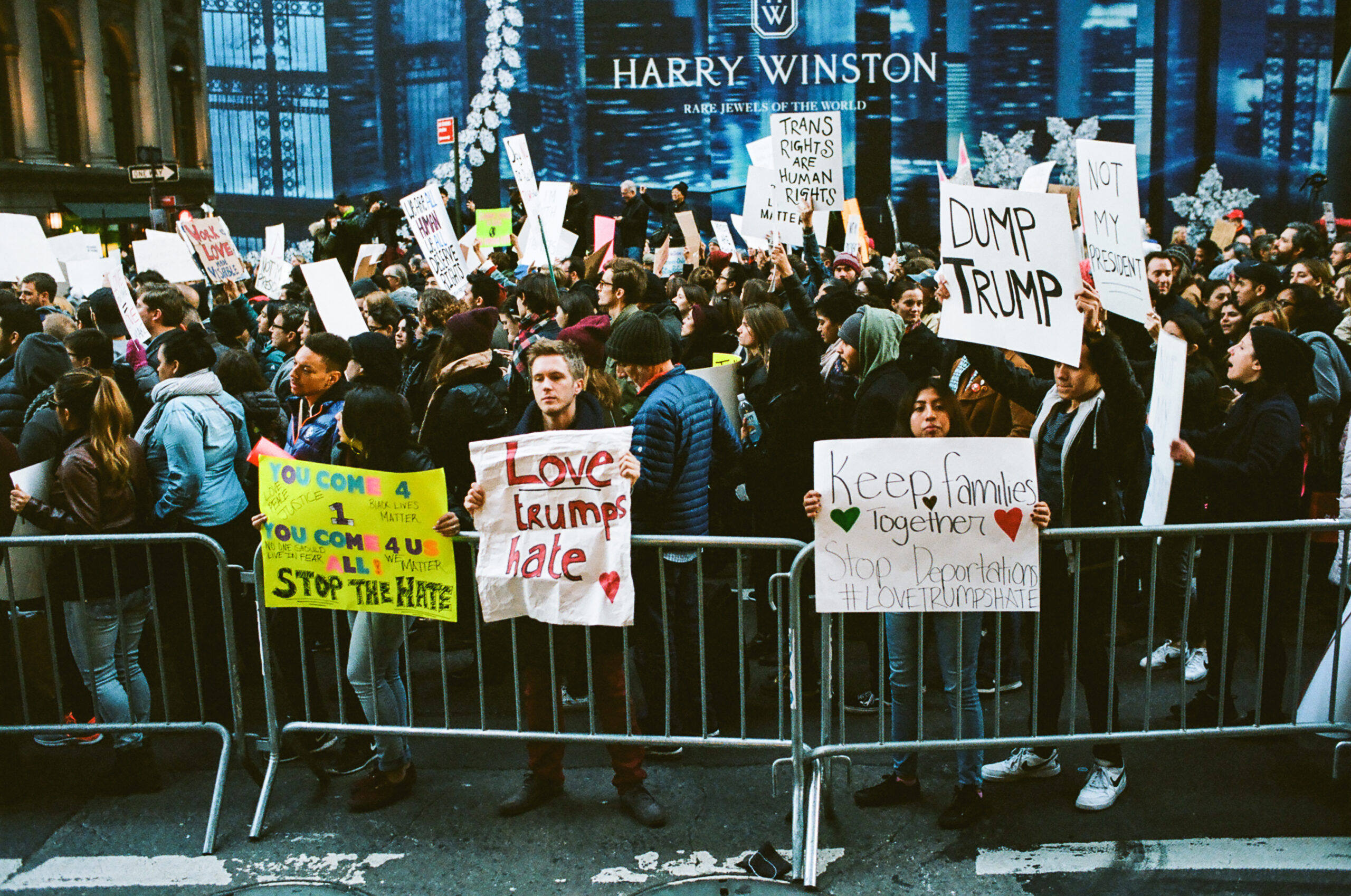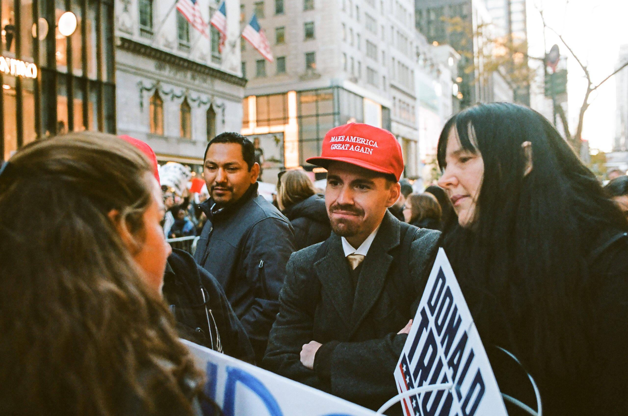 Vincent Pflieger alias Streetadelic, photographe et vidéaste français expatrié à New York, était sur la 5e avenue en bas de la Trump Tower muni de son appareil après l’élection du futur (improbable) président américain. Rencontre avec le street photographer, et retour sur cet événement malheureusement marquant de 2016 grâce à ses clichés accentuant l’énergie et l’humour de la foule en ce lendemain de cuite collective.