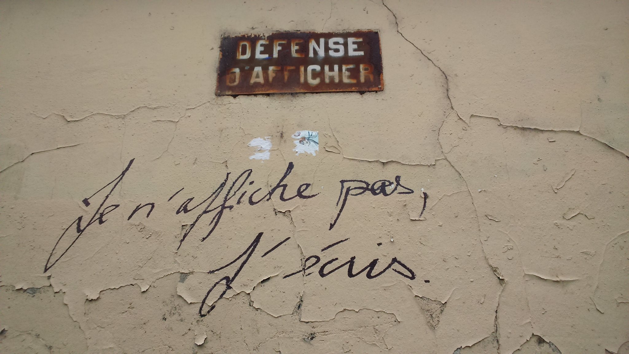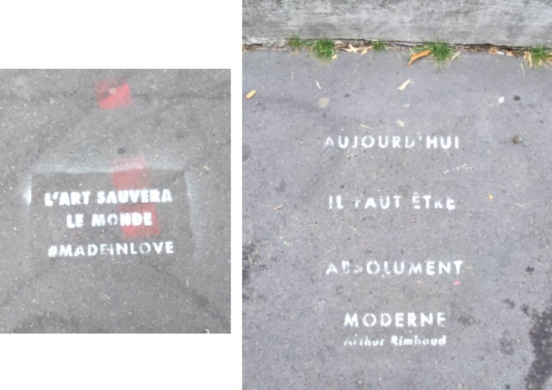 « L’art sauvera le monde », peut-on lire sur le bitume d’un trottoir de Paris. Un peu plus loin dans la même rue, un passant me jette un regard étonné alors que je braque mon appareil photo vers le sol pour emporter avec moi la phrase « Aujourd’hui il faut être absolument moderne », écrite en blanc, au pochoir, sur le bitume sombre. Je continue mon chemin, jusqu’à ce que mon regard s’arrête sur une petite phrase écrite sur un mur dont la peinture part en morceaux, juste sous une plaque rouillée mentionnant « Défense d’afficher ». À cela, un(e) inconnu(e) a ironiquement répliqué : « Je n’affiche pas, j’écris ».