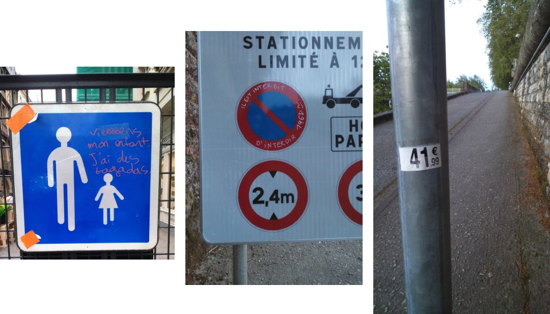 Il s’agit souvent de petites piques subversives contre des règles urbaines, des traits d’humour ironiques qui, avec un peu d’imagination, renvoient à bien plus que ce que l’on perçoit au premier regard. Un feutre suffit pour questionner des interdictions et les tourner en dérision : interdiction de stationner, défense d’afficher… L’espace urbain fourmille de règles, expressément formulées ou tacites, dont nous n’avons plus forcément conscience. Déambuler dans la ville sans destination précise, sans être pressé par le temps, juste pour le plaisir, permet d’être attentif à ces petites traces laissées dans l’espace urbain par des inconnus, des inconnus ayant envie de s’exprimer, et qui exhortent les passants à faire de même : « exprime-toi », « n’ayez pas peur ».