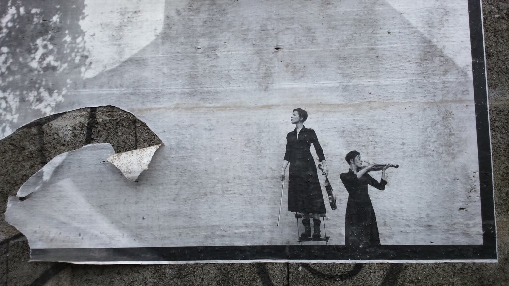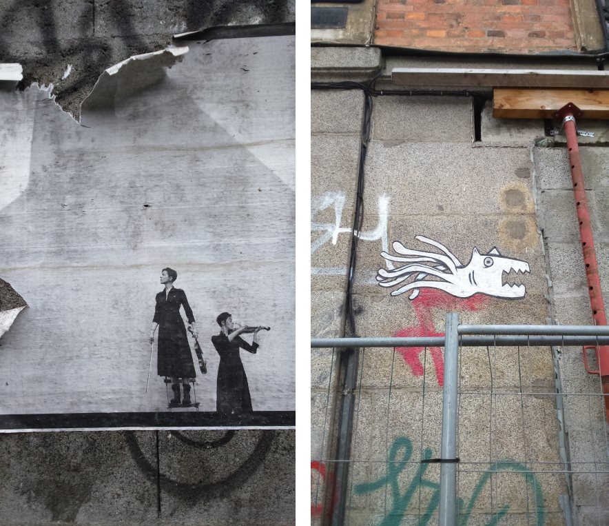 Qu’il s’agisse d’une œuvre de musée ou d’un collage égayant la grisaille d’un mur, la portée est cependant la même, intellectuellement et émotionnellement : la vue de deux violonistes, perdues dans l’espace rectangulaire d’une affiche grise aux bords déjà lacérés, a sur moi un impact considérable, un impact tel qu’il me fait m’arrêter en pleine rue, le regard plongé dans cette affiche, dans cet espace de solitude dans lequel sont enfermées ces deux jeunes femmes, violon au poing, dont le regard déterminé porté vers un au-delà excédant les bords de l’affiche, des bords déjà ouverts et déchirés comme pour mieux exprimer la fuite, m’interpelle et m’emplit d’un sentiment de tristesse, métissé d’espoir et de détermination. Un peu plus loin, un monstre hybride fait de papier, perdu entre chien et calamar dans l’évolution des espèces, ouvre ses crocs sur les parpaings, braque un regard menaçant sur moi qui ose le dévisager, et semble s’enfuir en agitant ses tentacules.