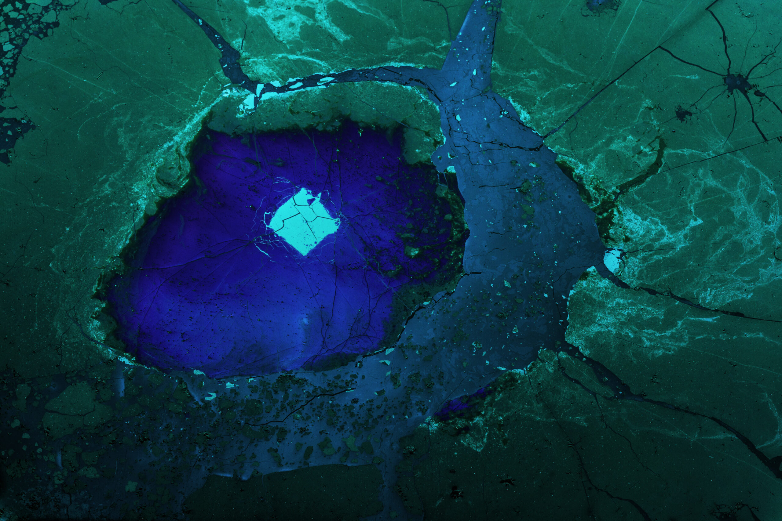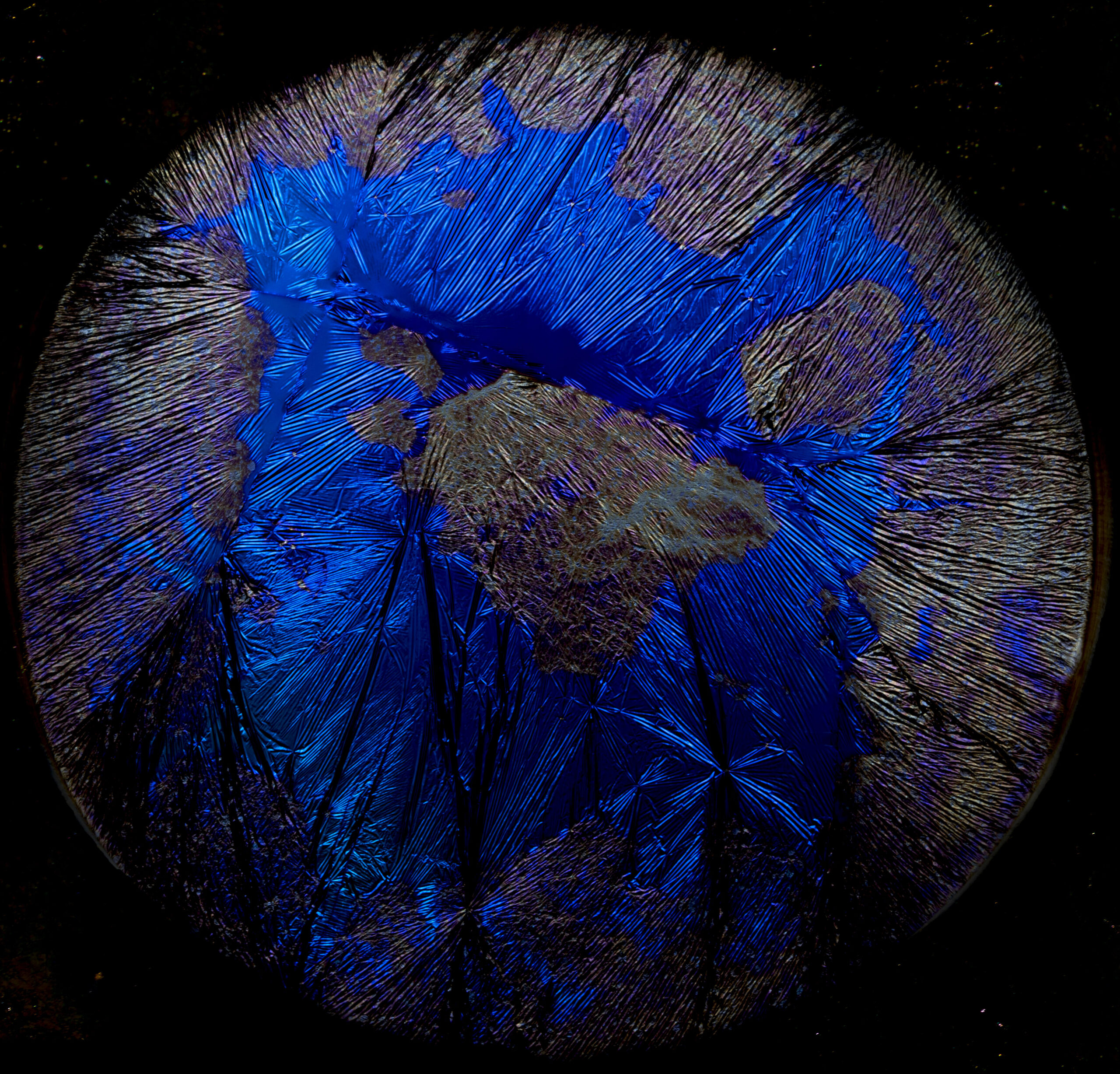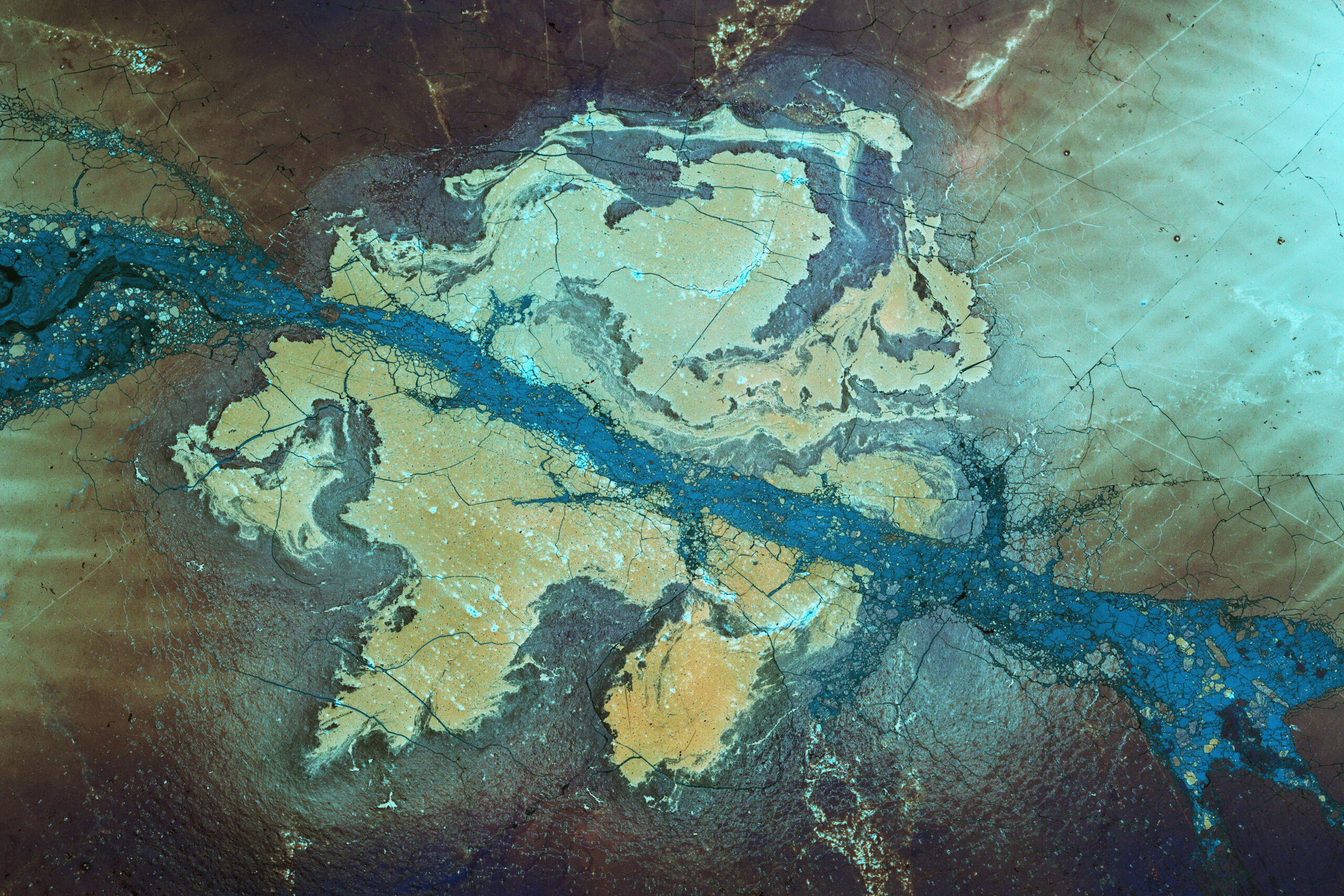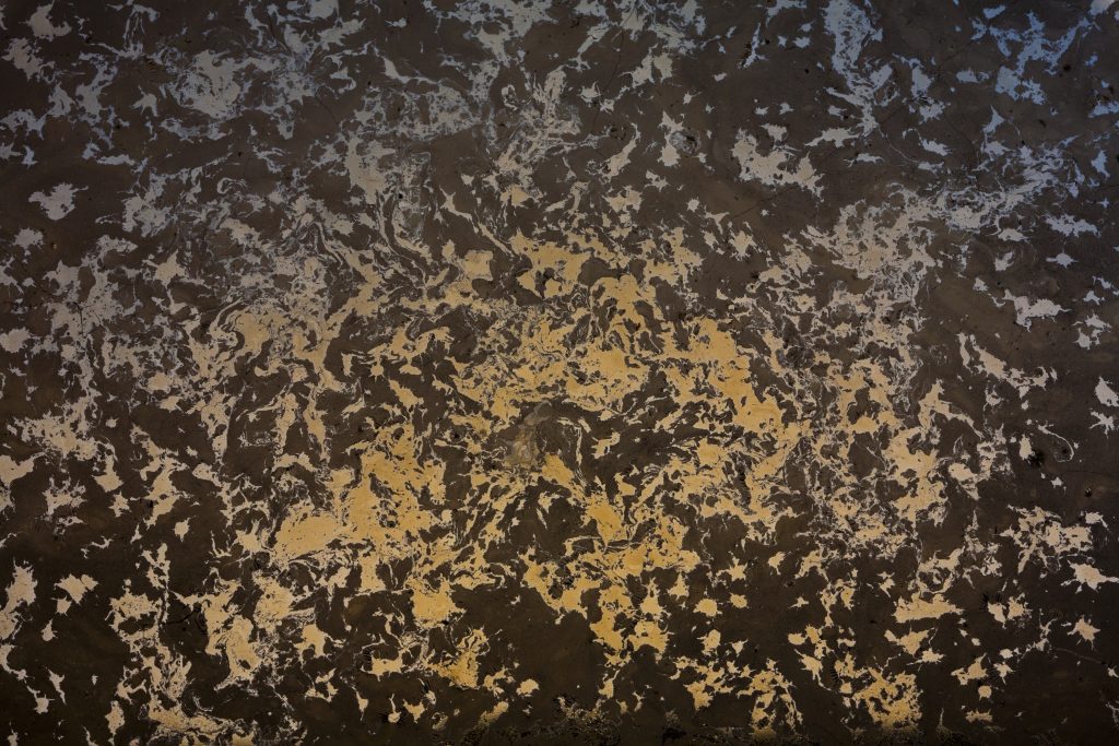 Arthur Grand : C’est une espèce de résidu qui se forme à la surface du thé. Ça s’appelle le « tea scum« . Son apparence dépend de différents paramètres : l’eau, sa minéralisation, la température, le taux d’humidité, la nature du thé que tu fais infuser et la nature du récipient dans lequel tu mets le thé. Tout cela agit ensemble pour former une pellicule très fragile qui change pendant environ une semaine et qui ensuite commence à moisir. La matière s’accumule pendant 36 heures environ et tu peux travailler dessus. Si tu enlèves un petit bout de cette surface de résidu, il y a encore du tea scum qui va se déposer à cet endroit vide, mais il aura une texture et une couleur différentes. Ça va remplir des interstices, interagir avec une partie infime qui était restée à la surface de l’eau, donc cela aura une forme ou une couleur particulières. C’est assez vertigineux, tu peux faire des choses incroyables.