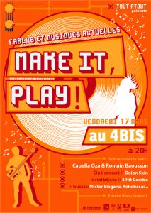 Pour découvrir l’aboutissement de cette aventure humaine, créative et musicale dans laquelle s’investissent ces jeunes depuis novembre, on vous donne rendez-vous vendredi 17 mars au 4Bis de 20h à 22h pour la soirée Make It, Play !