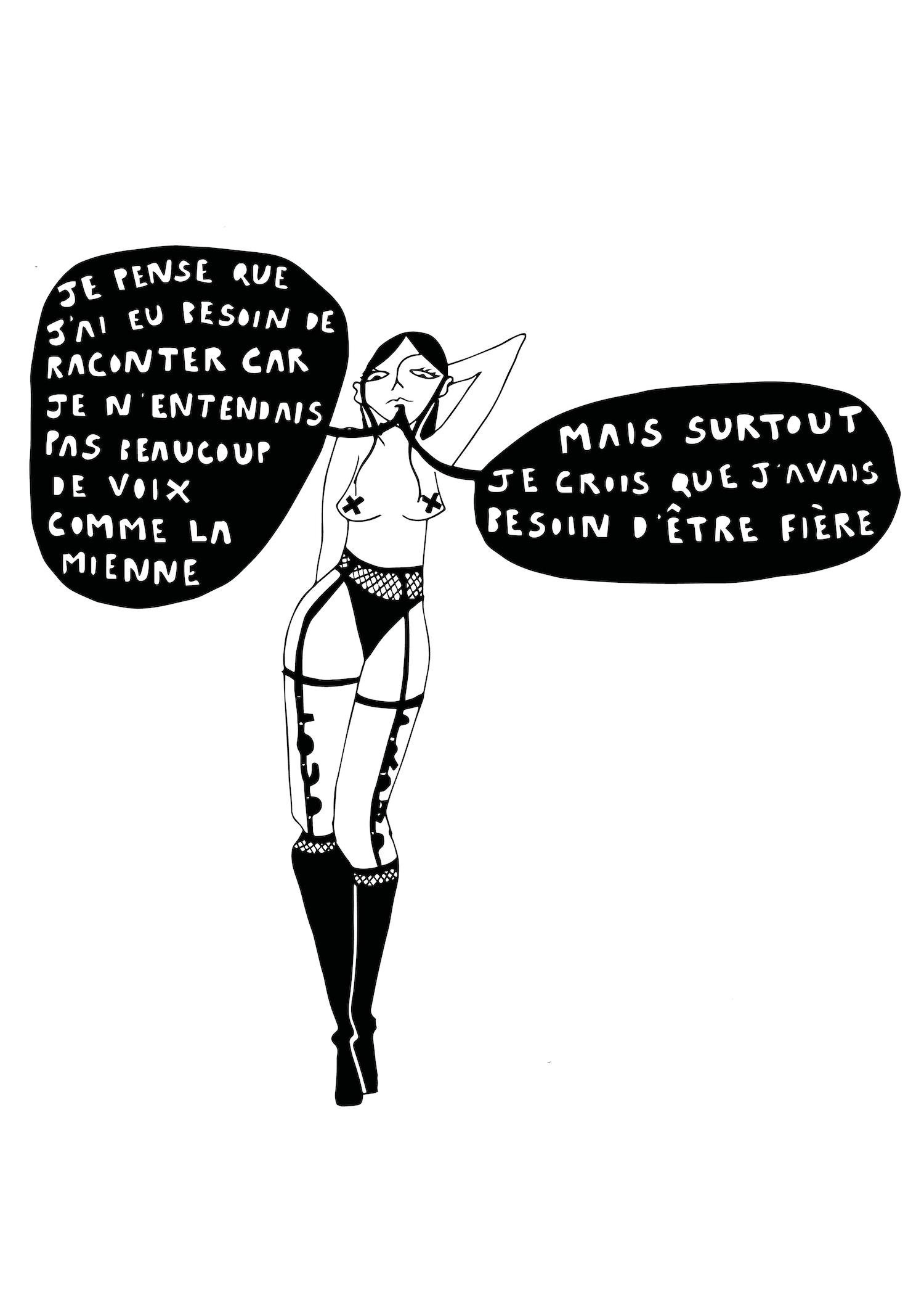 Le terme pro-sexe est un peu biaisé parce que oui, le sexe peut être un domaine de libération, de déconstruction, mais il a un côté « injonction à la baise ». Pour moi, c’est un terme qui a été un peu trop utile aux mecs cis hétéro, comme si une meuf déconstruite c’était une meuf hyper sexuelle, toujours disponible sexuellement, ce qui les arrange bien. Alors que non, si tu as envie d’être hyper sexuelle c’est cool et il n’y a aucune raison que tu sois stigmatisée pour ça. Mais c’est tout aussi cool qu’une personne utilise sa liberté de choisir d’éradiquer le sexe de sa vie, parce qu’elle n’aime pas faire du sexe. L’idée c’est de trouver une manière de militer qui permettrait à toustes la liberté de réellement choisir. D’où le pro-choix, même si quand on parle de travail du sexe la notion de choix est assez floue et pas très ancrée dans la réalité plurielle des travailleur·ses du sexe. Il y a des TDS, comme moi par exemple, nées avec assez de privilèges pour pouvoir bénéficier d’un panel de choix assez vaste pour que la notion de choix soit juste. Mais il y a aussi tout un système raciste, transphobe, classiste, etc., qui rend parfois la notion de choix pas très équitable. Par exemple, quand tu n’as pas de papiers, tout de suite la notion de choix n’est plus la même. Être femme de ménage c’est rarement un métier choisi, parmi un panel de choix large, mais ce n’est pas pour autant un choix criminalisé. Pour le travail du sexe ça devrait être pareil. Des parcours différents, mais des droits pour toustes. C’est pour ça que le terme pro-droits que t’utilises est super juste.