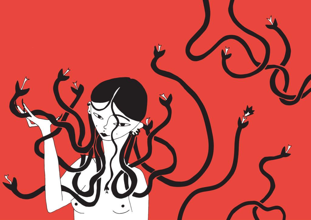 Peut-être avez-vous vu passer ses illustrations percutantes sur son compte Instagram, où elle publie ses créations depuis mars 2020. Alliant contes mythologiques et putanat, nouvelles sorcières et pédagogie, sales féministes et réflexions crues, c’est avec humour et vulnérabilité que Klou illustre un manifeste percutant et militant pour les droits des travailleur·ses du sexe (TDS). Bagarre érotique, son premier roman graphique, est un récit utopiste, politique, loin des clichés, un hommage aux marginales hystériques en bas résilles. Klou défonce les stigmates, la putophobie et anéantit le capitalisme avec radicalité. Son récit, tendre et radical, est une lutte pour être soi, une lutte pour la liberté. Klou reprend les rênes, chamboule les règles et nous emmène avec elle pour tout disjoncter. « L’idée c’est de trouver une manière de militer qui permettrait à toustes la liberté de réellement choisir » m’explique-t-elle, quelques semaines après la sortie de sa BD (avant la décriminalisation officielle du travail du sexe en Belgique donc), lors d’une rencontre où l’on a discuté de son œuvre entre personnes concernées.