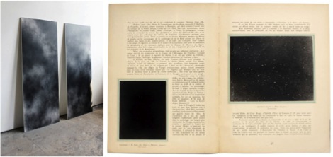 Les ciels de Dust to Dust, fragmentés en diptyque, ou ceux de l’œuvre Blackout Book, qui s’éparpillent sur les pages d’un livre d’histoire de l’art, sont autant de fenêtres sur l’infini.