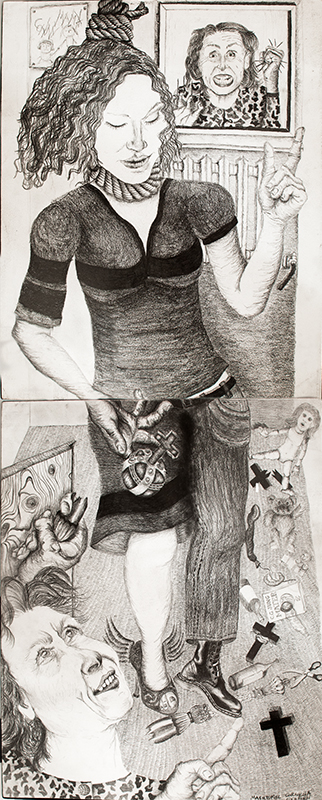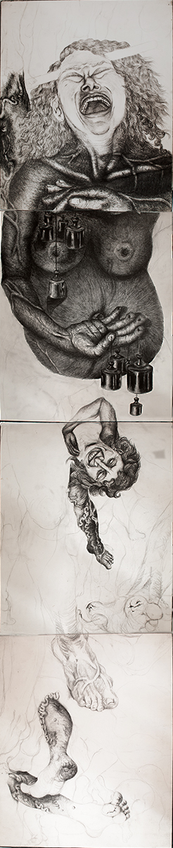 La violence imposée aux femmes trouve sa source dans un réseau dense de normes et de ramifications sociales, construit par un système politique hétéro-patriarcal. Cette violence sociale qui s’impose aux corps et aux esprits, Cornelia Eichhorn lui donne forme dans de nombreuses œuvres autour du corps féminin, dont les séries Jeux de force (2011), et Balance à peser apaisée (2014).