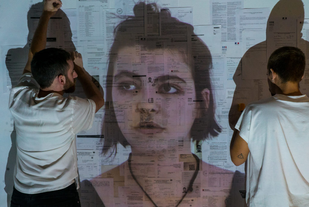 À l’image de cette initiation qui repose sur la rencontre, le déplacement, et le dépassement, l’œuvre de restitution « Contracto » rassemble les médiums et offre une réflexion riche sur l’articulation complexe des notions d’identité, d’autorité, d’espace public et d’espace privé. L’installation nous plonge en immersion dans un lieu au parfum de salle d’interrogatoire, où documents et témoignages vidéo racontent dans une forme chorale le parcours du couple et de son installation en France. En présence silencieuse mais signifiante, les artistes sculptent l’histoire avec leurs propres corps dans l’installation. Ils accrochent un par un, séparément ou ensemble, des centaines de documents imprimés formant petit à petit une muraille de papiers sur laquelle sont projetés les interrogatoires réalisés avec leurs proches à leur sujet. Données, témoignages, gestes et émotions recomposent par la négative le processus de construction identitaire du couple en France.
