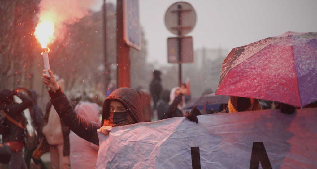 Si l’ambiance se voulait festive malgré tout, la déception des manifestant·es restait palpable, comme l’exprime Maëlys, 25 ans, étudiante aux Beaux-Arts : « Qu’est-ce que ça rajoute ou pas à la manifestation qu’il y ait de la musique ? Dans tous les cas, on gueule, on piétine. » Les effets de la réserve forcée par le contexte sanitaire et la peur des violences policières semblent dans tous les esprits. Maëlys décrit une forme de résignation contrariée : « Au bout d’un certain moment tu commences à t’adapter et tu te dis que, bon, déjà, on a le droit de marcher, on a le droit de circuler, de patienter dans le froid… » ironise-t-elle, avant de continuer plus sérieusement : « Mais oui c’est clair, c’est la merde. C’est de la musique putain ! Ça ne tue personne, ça n’a jamais tué personne, ça ne tuera jamais personne. » Derrière elle, une rangée de boucliers de CRS fait office de chasse-neige humain.
