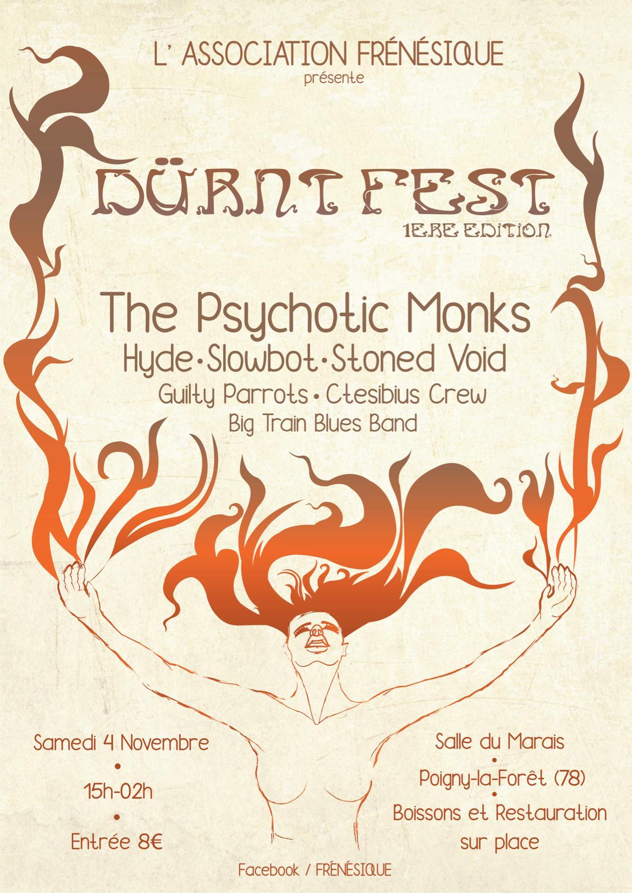 Pierre-Yves : Pour la programmation, nous voulions une évolution entre le premier concert de 16h et le dernier de 01h du mat’. Ça démarre par un groupe local, Big Train Blues Band, qui alterne entre reprises blues/rock (B.B King, Eric Clapton, Bob Dylan…) et compos originales. Ils sont suivis par Ctesibius Crew, un groupe steam punk délirant et surprenant. Nouveau changement de style avec Guilty Parrots, groupe parisien de prog/rock alternatif dans la lignée d’Opeth et Porcupine Tree qui annonce l’aspect plus brut et psychédélique de la suite des événements. Arrive The Psychotic Monks, une formation illustrant une vision moderne du psychédélisme, avec un univers puissant et une identité très marquée. Ensuite, on corse un peu les décibels avec Slowbot et son stoner bien nerveux, suivi par Hyde, au son massif et efficace. La soirée se conclura sous les airs sombres et mélodieux de Stoned Void.
