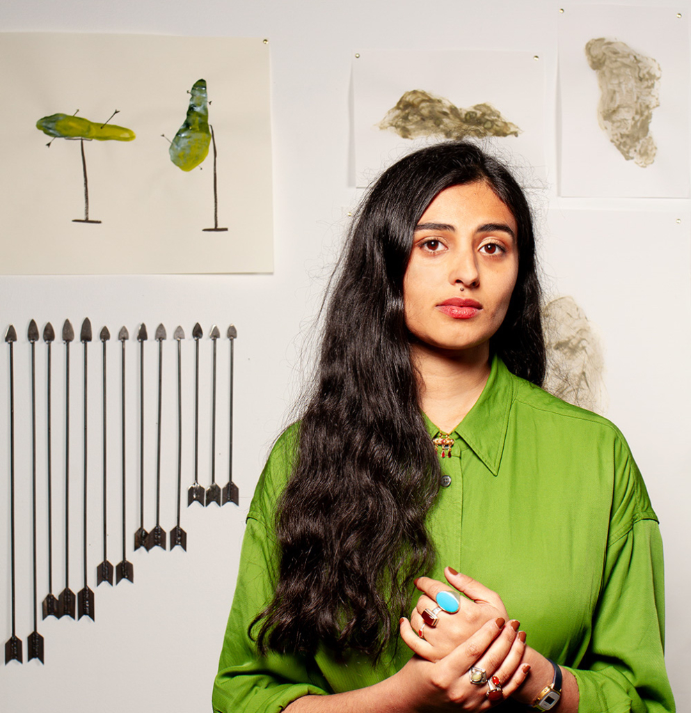 Ma famille est irakienne mais je suis née à Blackpool et j’ai grandi à Édimbourg. Je n’ai jamais cru qu’on avait une Histoire propre, nous, les personnes issues de la diaspora. À l’école, on nous enseignait l’Histoire de l’Égypte ancienne. À la télévision, c’était des images de la guerre en Irak. Entre les deux, il n’y avait rien. Je crois que, comme moi, les personnes qui sont dans un espace de diaspora essaient de tisser des liens avec un héritage invisible. Je puise dans des poésies et des contes de l’ancien Moyen-Orient. J’y mêle les récits que mes parents m’ont transmis : leurs souvenirs, leurs expériences. Je ne suis jamais allée là-bas, alors je m’invente toute une mythologie autour du pays, des objets et d’un bestiaire magique. Dans ma tête, c’est comme une géographie imaginaire, avec une chair, une consistance.
