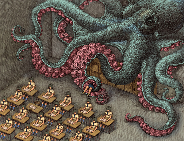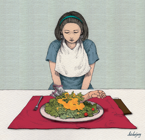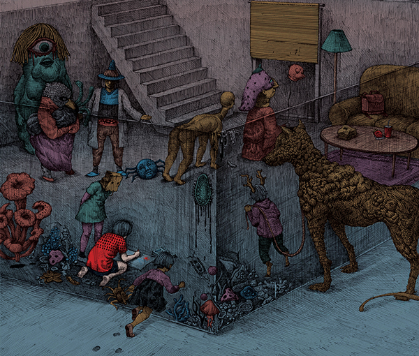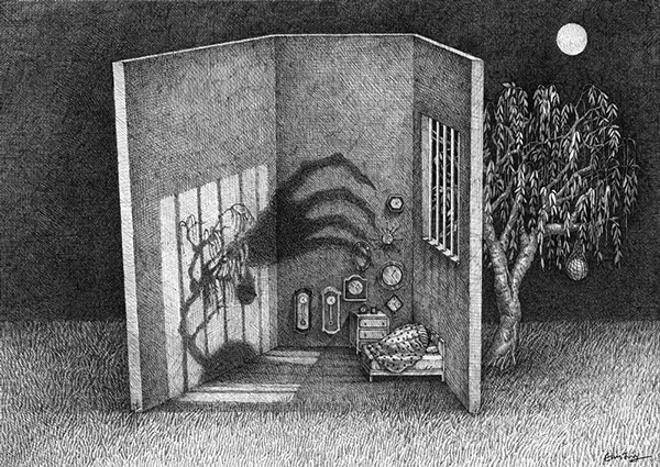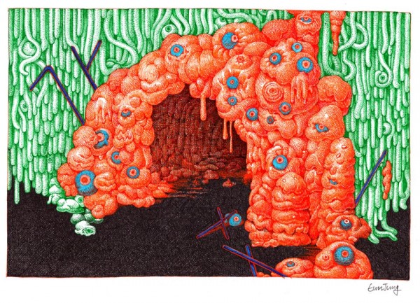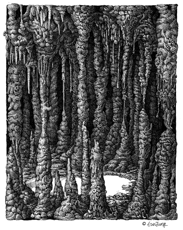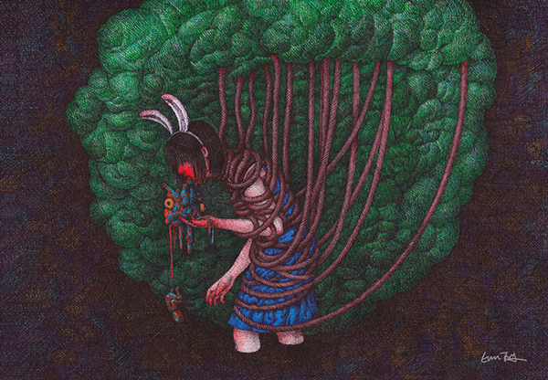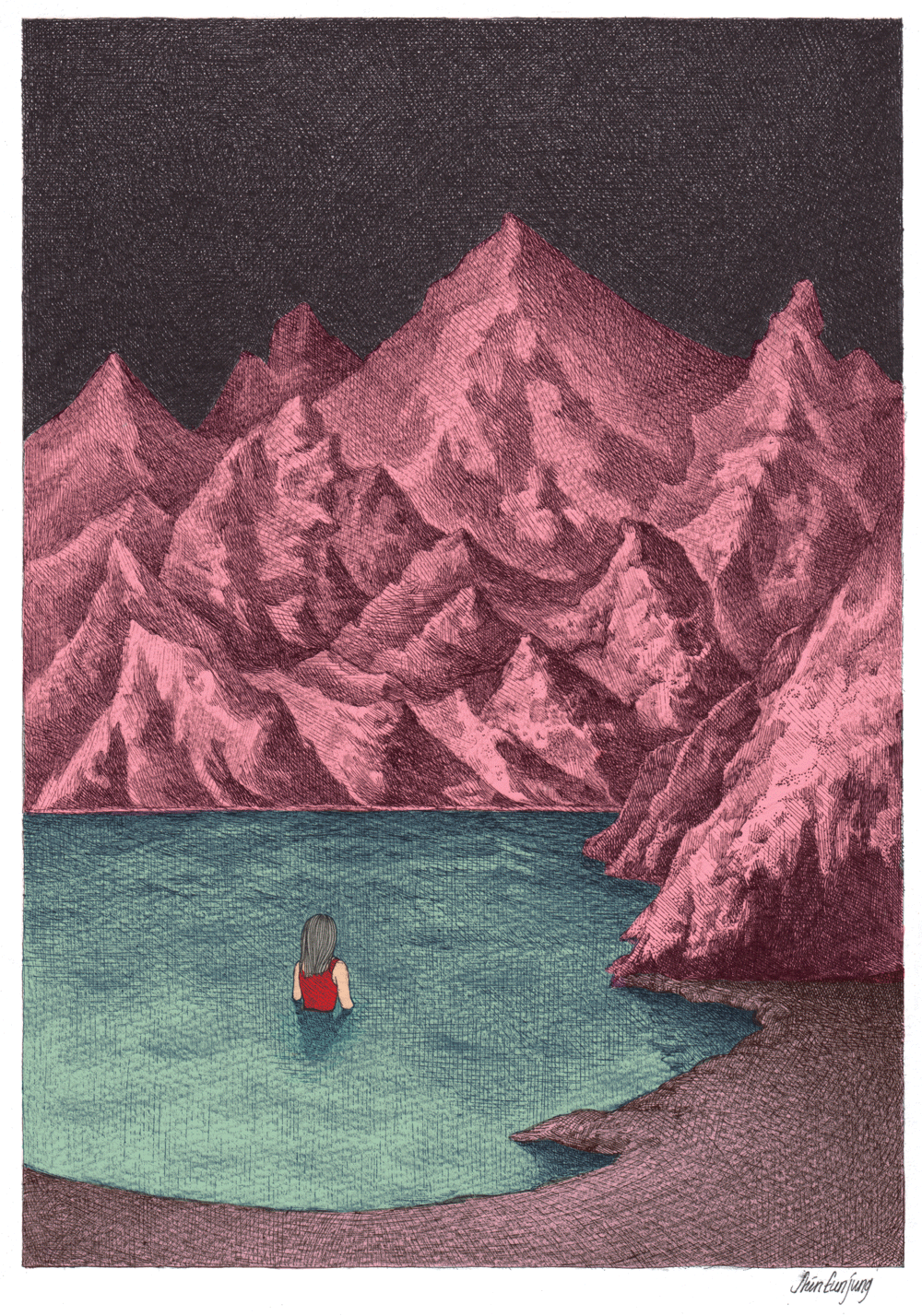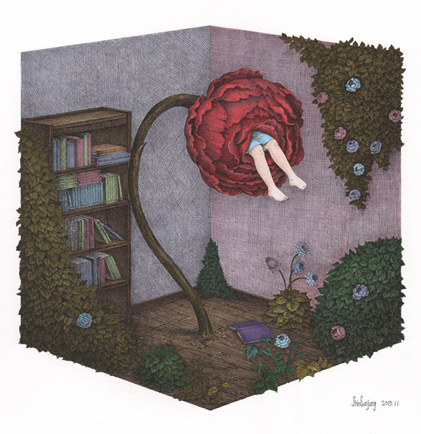 L’encre d’Eunjung Shin – artiste basée à Séoul – entrouvre les portes d’un imaginaire angoissant. C’est en concentrant notre attention sur les détails des illustrations – axées en partie sur l’enfance solitaire et le rêve – que l’on résout l’énigme d’un univers composé d’éléments denses à la symbolique profonde. Les détails font pencher la balance vers l’absurde, l’effroi et l’humour noir parfois, au cœur de scènes au premier abord innocentes et enfantines. C’est dans cette dichotomie que les dessins d’Eunjung Shin puisent toute leur force poétique.