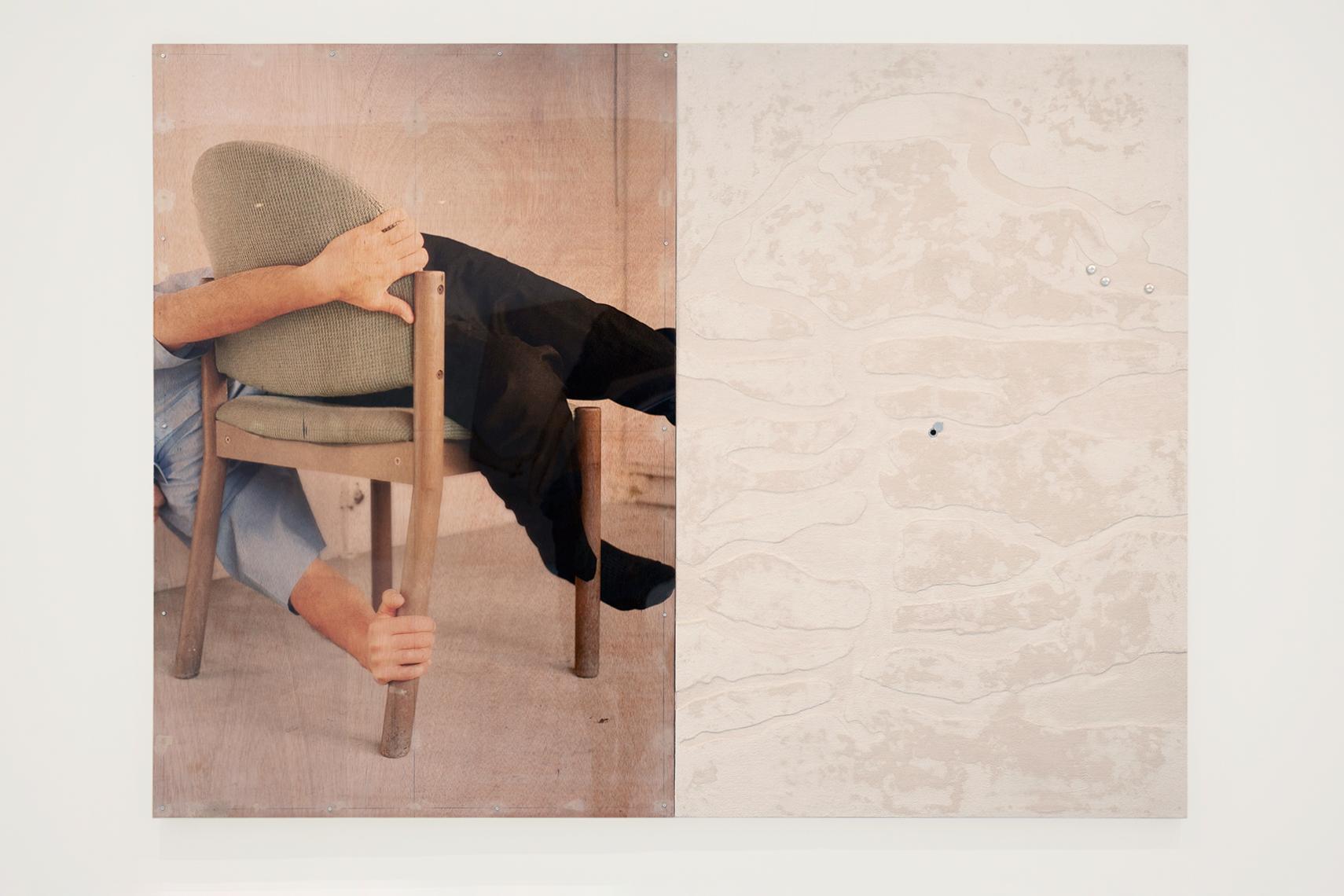 Dans un diptyque, c’est un corps tout entier qui se contorsionne sur sa chaise de bureau. En évoquant une esthétique parfois clinique, empruntée au vocabulaire de la kinésithérapie et de la médecine du travail, l’artiste interroge le paradoxe du soin appliqué à notre société de la performance : l’injonction au care, le fait de prendre soin de soi à grand renfort de développement personnel, mais un soin béquille, pensé pour que l’on puisse continuer à nourrir l’effort permanent que l’on impose à nos corps, à nos têtes, un soin calibré pour que l’on soit toujours plus efficaces.